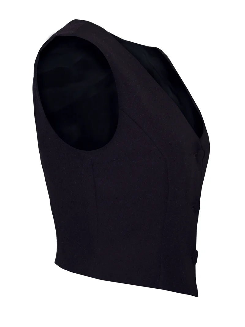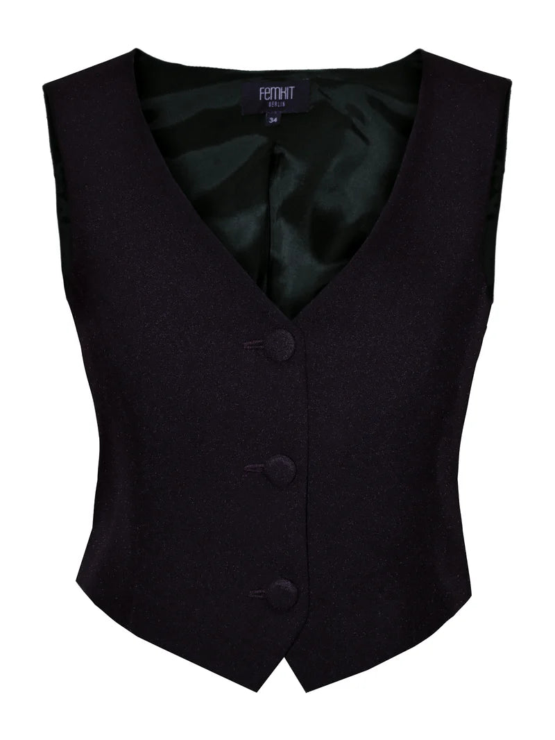The Dona vest from Femkit in classic black impresses with its elegant V-neck and figure-hugging fit. With its covered buttons and tailored cut, it can be combined in a variety of ways, whether worn over a blouse or shirt, or as a stylish standalone piece. Its high-quality workmanship and timeless design make it incredibly versatile.