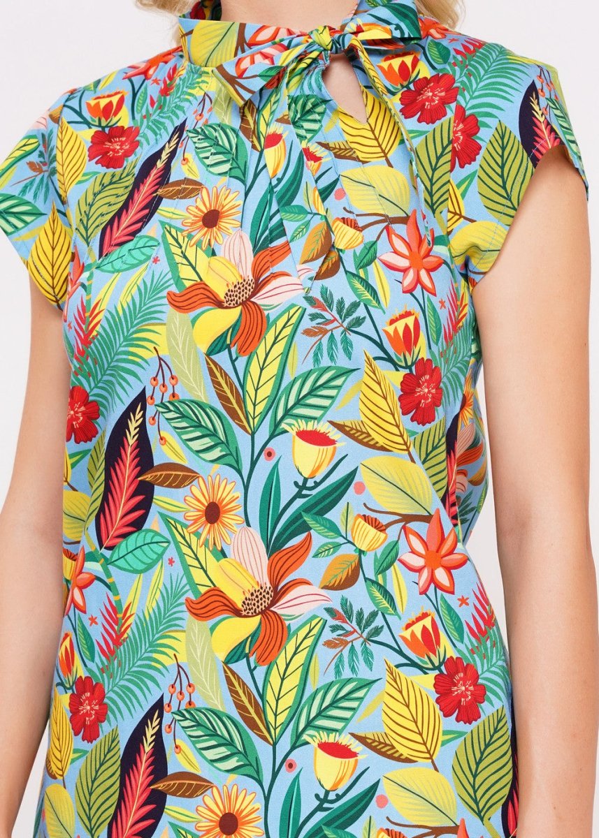 Die farbenfrohe und ausdrucksstarke Schleifenbluse Maui aus 97% Baumwolle und 3% Elastan von Circus Clothing verbindet ein lebendiges Muster mit einem angenehm elastischen Materialmix. Sie besticht durch einen Rundhalsausschnitt mit kleinem Stehkragen und Schleifenband, der leicht taillierten Form und den kurzen angeschnittenen Ärmeln. Laut Hersteller fair produziert in Indien.