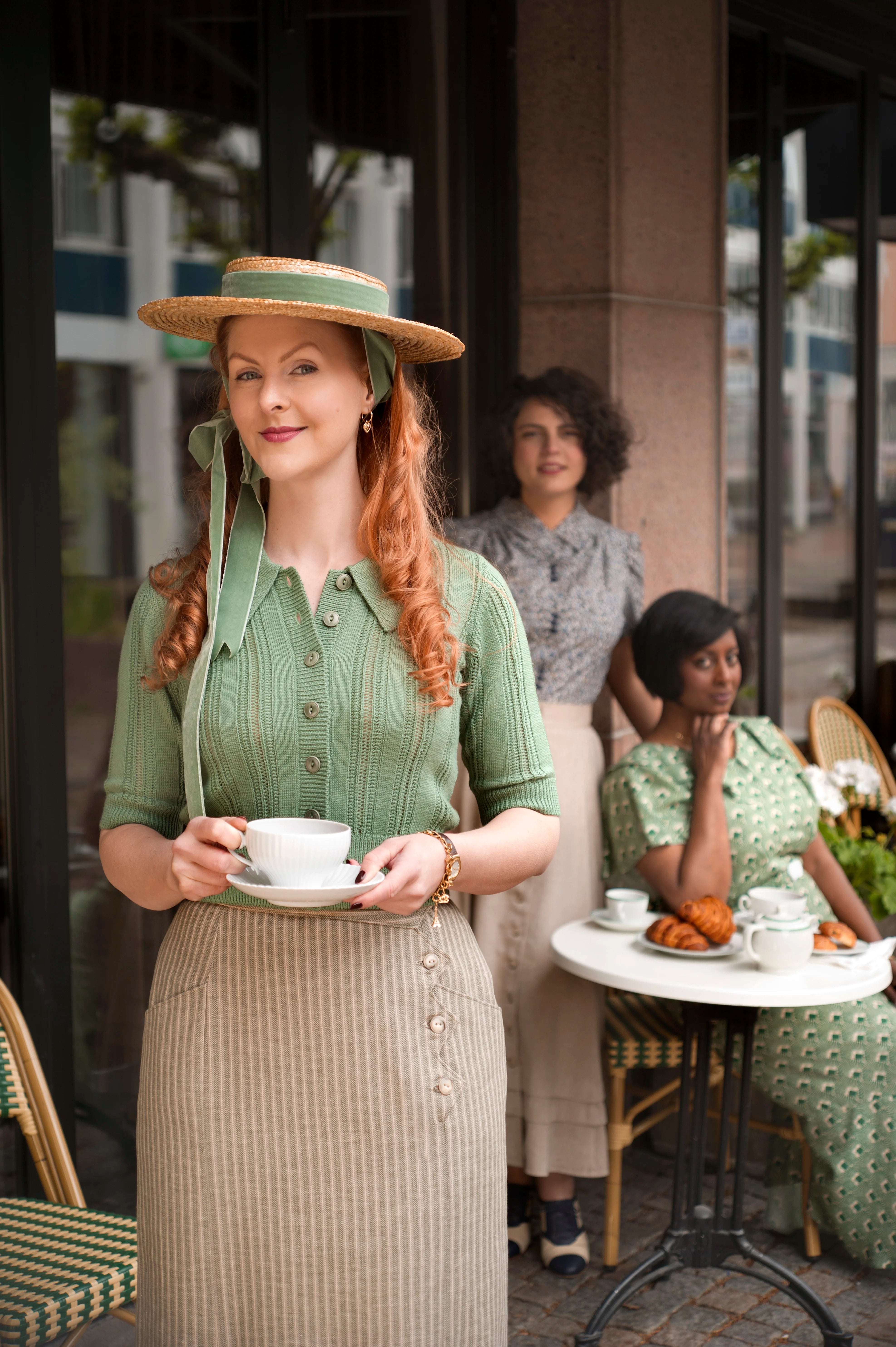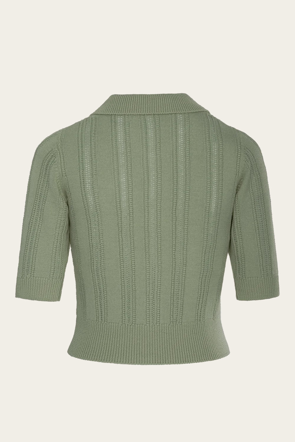 Diese überarbeitete Version aus SS25 behält den spitzen Kragen, die taillenkurze Länge und die Dreiviertelärmel bei und ersetzt die großen Kontrastknöpfe durch kleinere Ton in Ton Knöpfe in Garnfarbe. Der Stil erinnert an die 1930er Jahre und passt sowohl zum Deco Dream Skirt als auch zur Lieblingsjeans. Aus leichter Wolle mit luftigem Spitzenstrickmuster gefertigt, ist sie ideal für wärmere Tage und kann geschlossen wie eine Bluse oder offen über Top oder Kleid getragen werden.