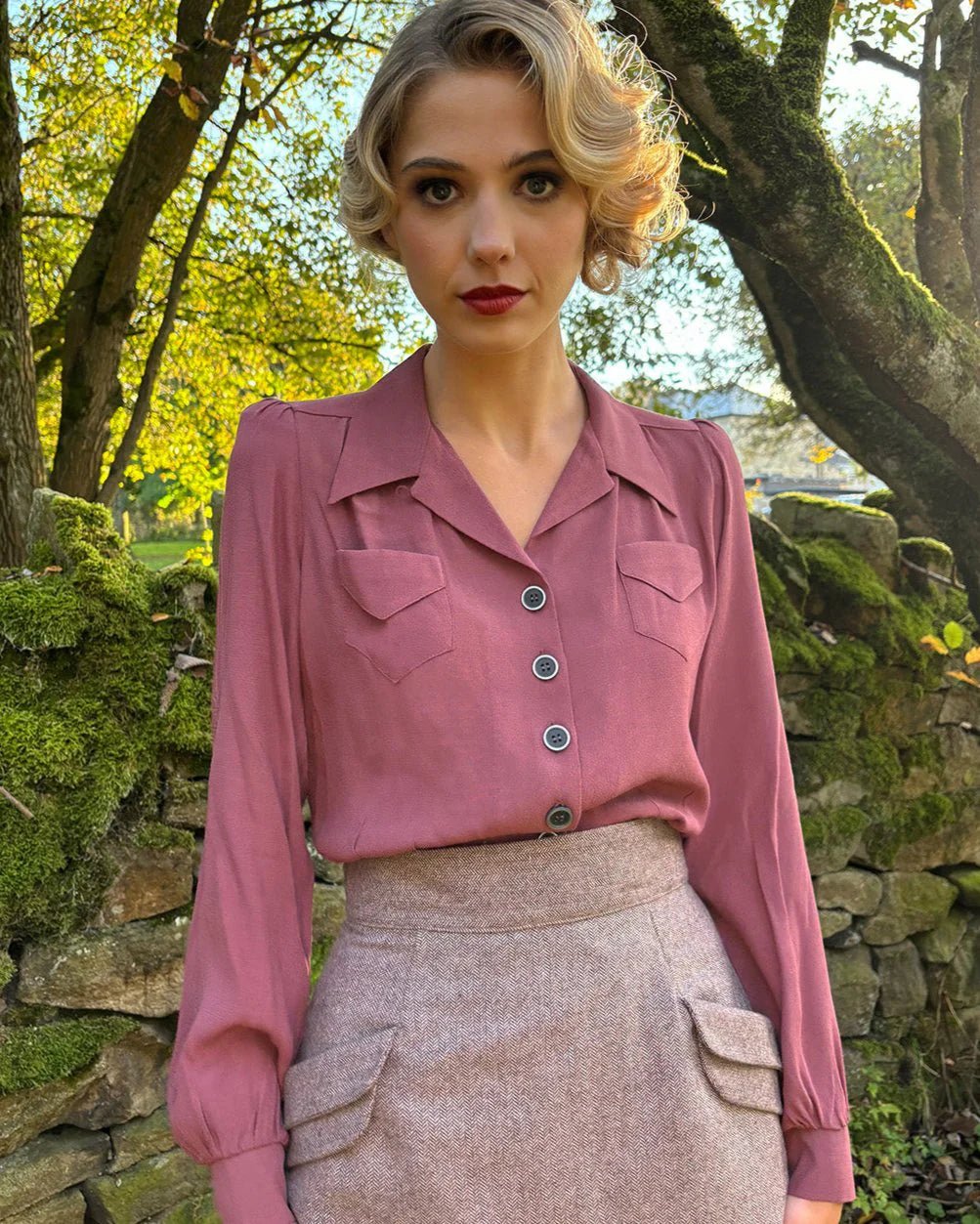 Die 1940s Sweetheart Bluse von The House of Foxy ist ein echtes Schmuckstück für alle Liebhaberinnen authentischer Vintage-Mode. Ihr Design greift die charakteristischen Elemente der 1940er-Jahre auf: ein wandelbarer Kragen, elegante Puffärmel mit Manschetten und eine durchdachte Schulterpartie mit leichten Raffungen und eingenähtem Schulterpolster, alles für die perfekte Silhouette.