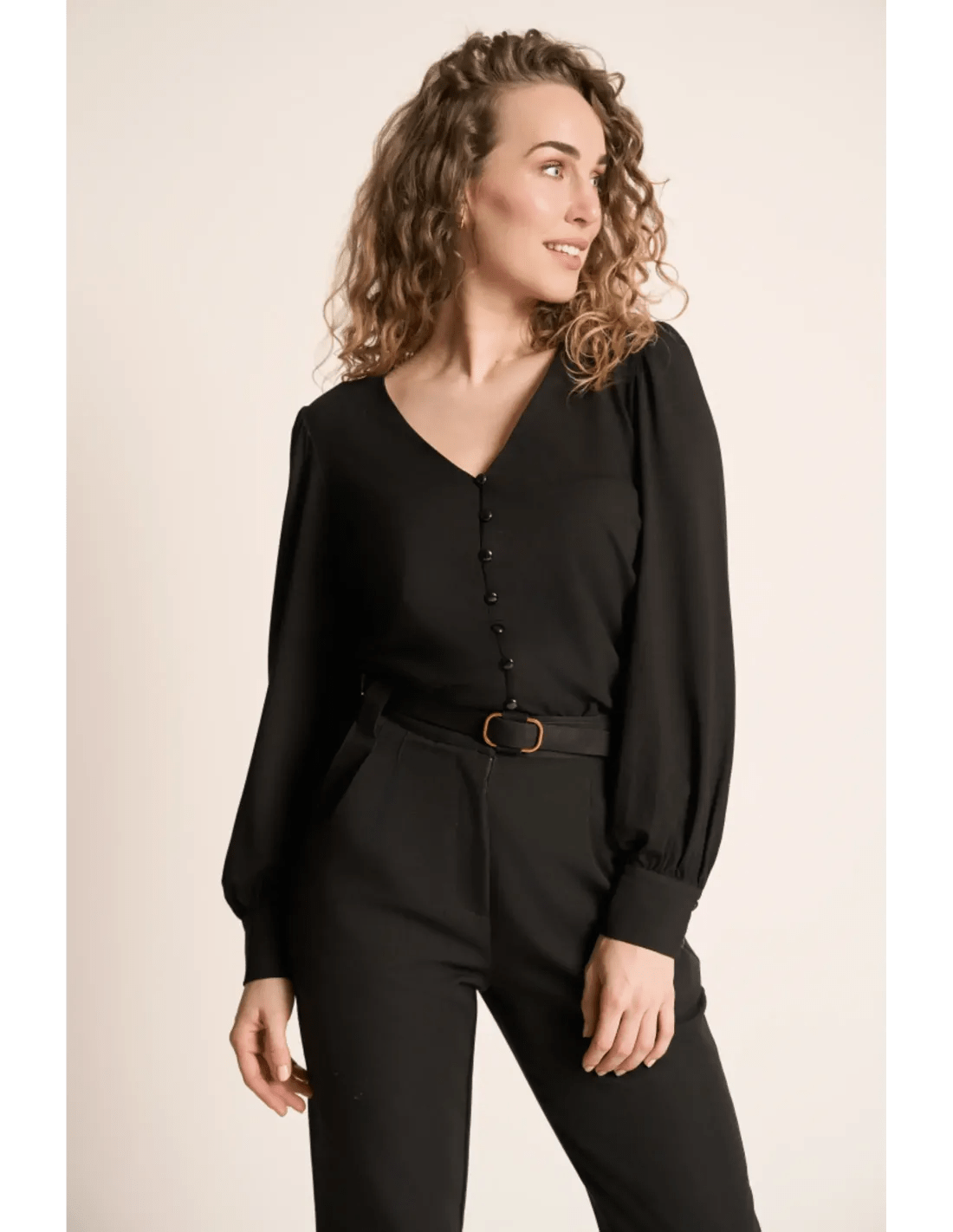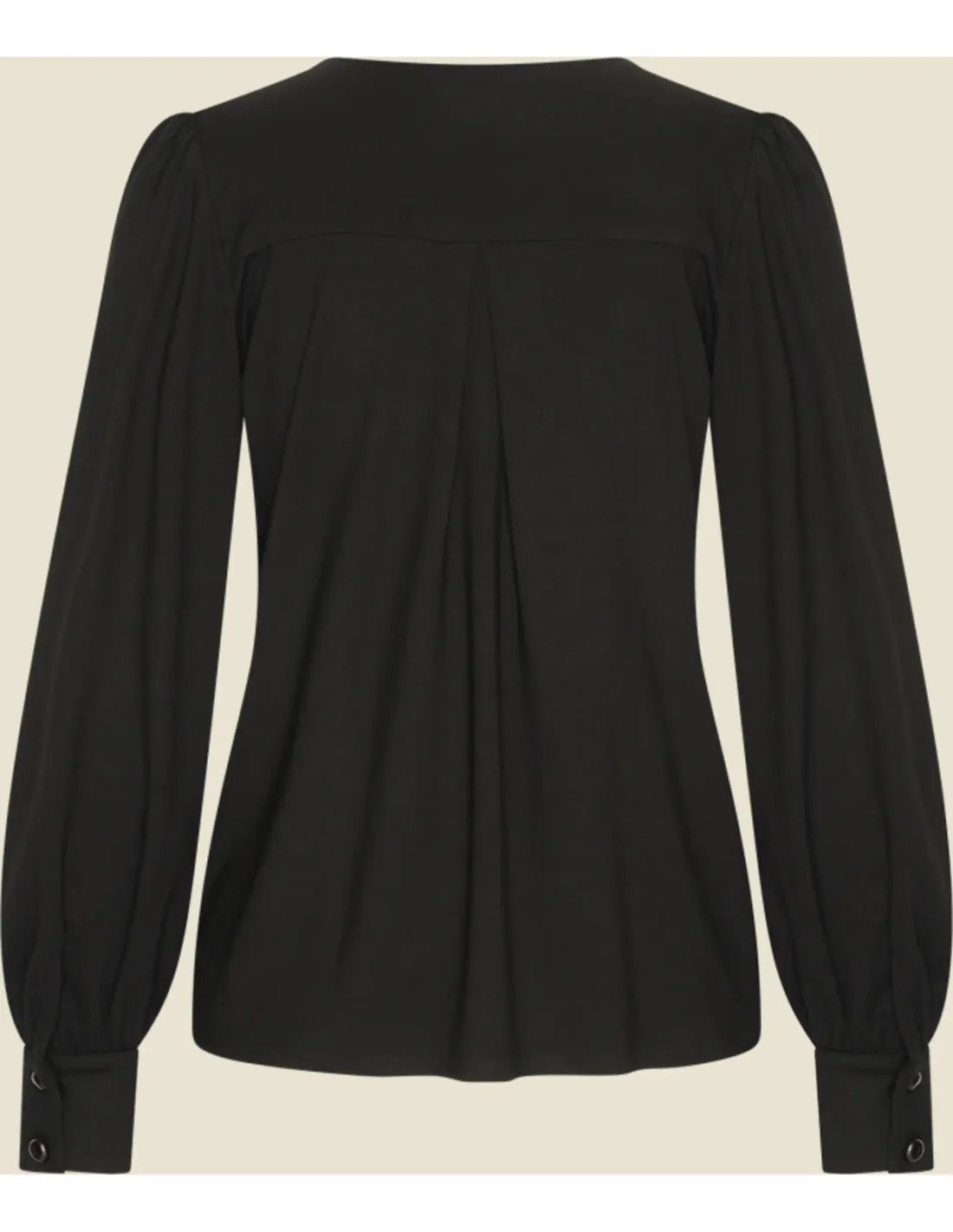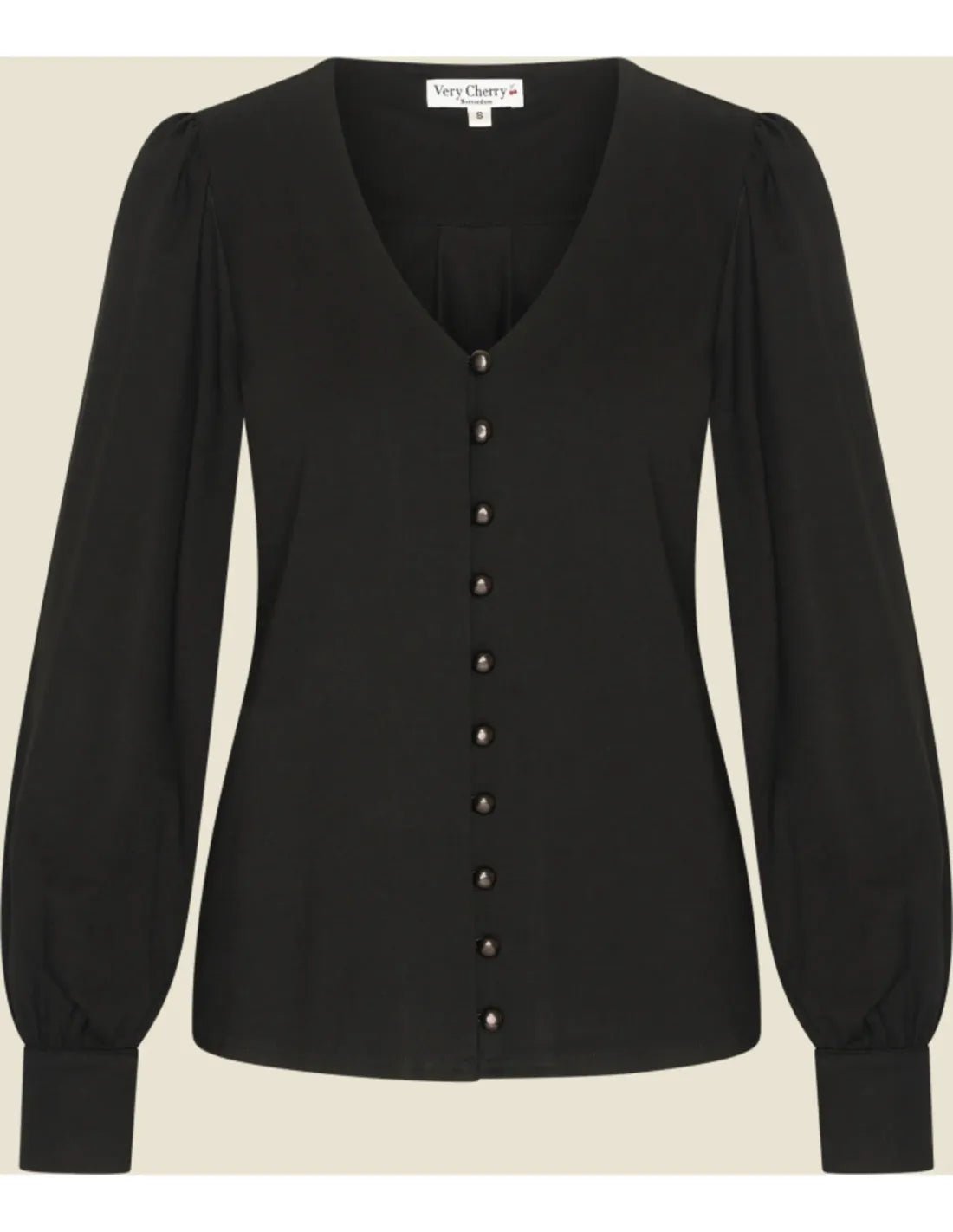 Die Celia Blouse Tricot Deluxe in Schwarz von Very Cherry ist eine fließende Damenbluse aus elastischem Jersey. Mit V-Ausschnitt, Puffärmeln und Knopfleiste vorn vereint sie femininen Look mit Tragekomfort.