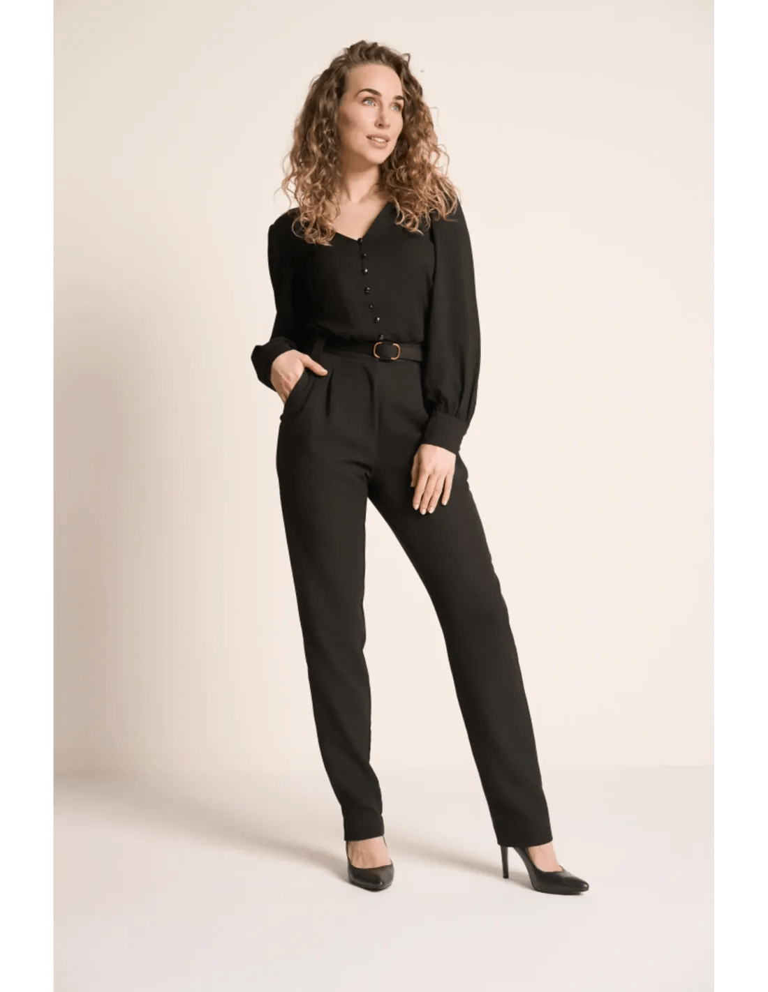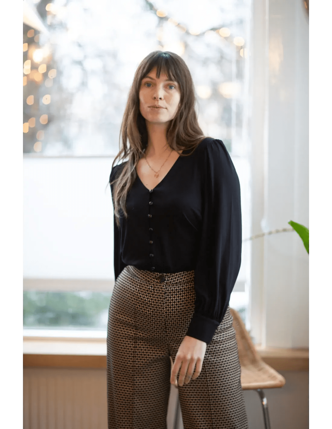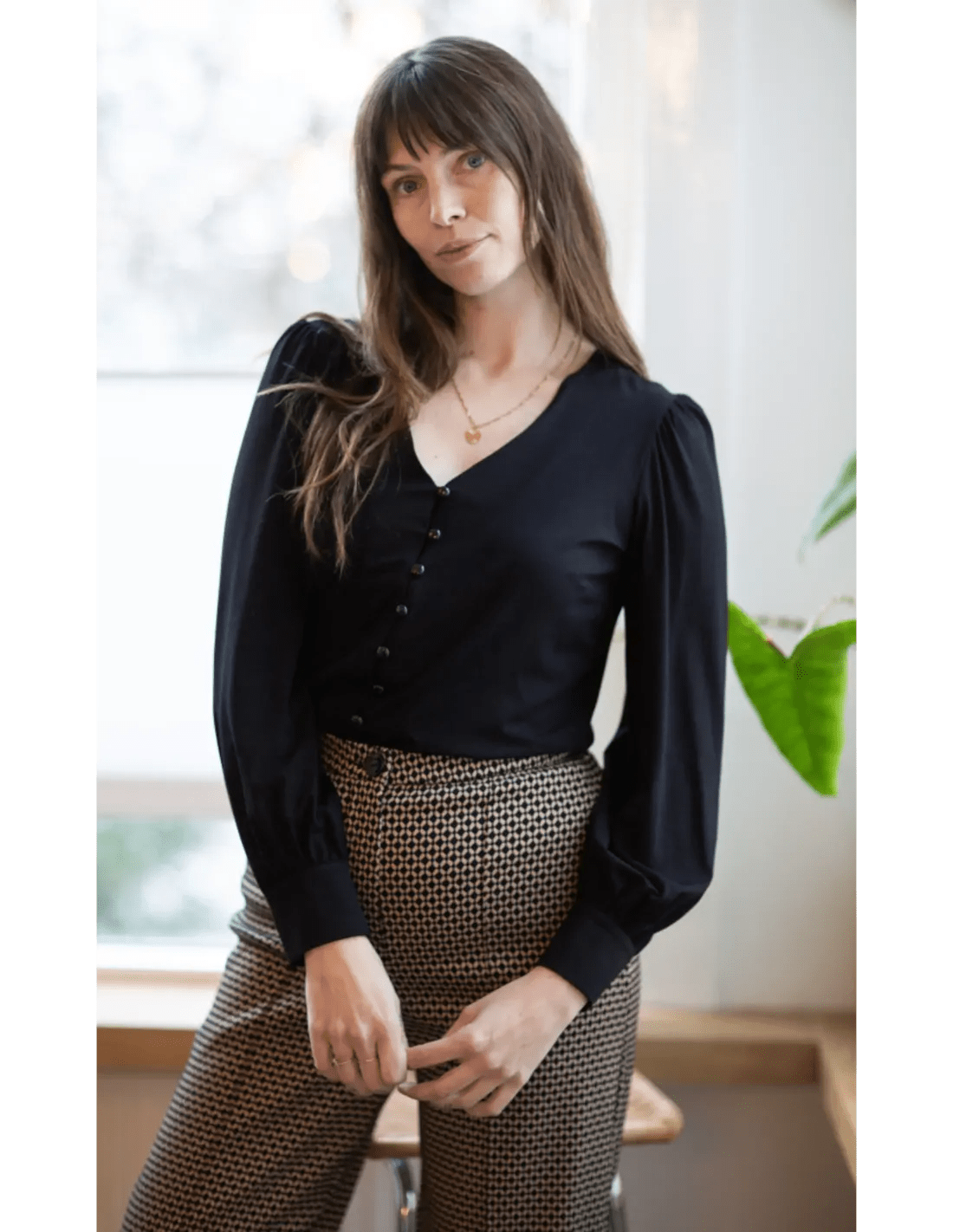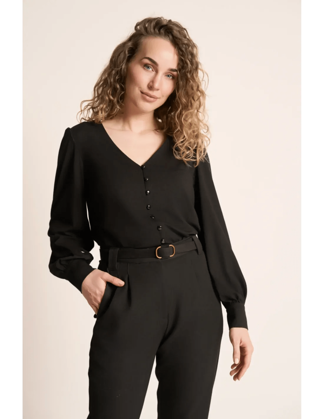Die Celia Blouse Tricot Deluxe in Schwarz von Very Cherry ist eine fließende Damenbluse aus elastischem Jersey. Mit V-Ausschnitt, Puffärmeln und Knopfleiste vorn vereint sie femininen Look mit Tragekomfort.