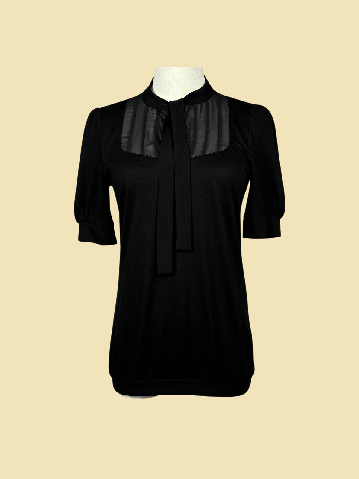 Die feminine Bluse Martha von Femkit in elegantem Schwarz begeistert mit transparentem Einsatz am Dekolleté und einer stilvollen Schleife. Die halblangen Puffärmel mit Bündchen und der taillierte Schnitt unterstreichen die feminine Silhouette. Durch ihr stilvolles Design eignet sich die Bluse perfekt für Büro, Alltag und besondere Anlässe. Durch die hochwertige Verarbeitung und das zeitlose Design ist sie vielseitig kombinierbar.