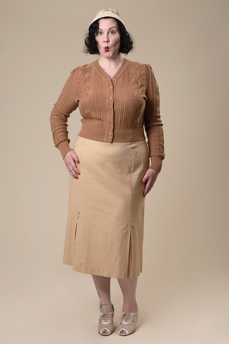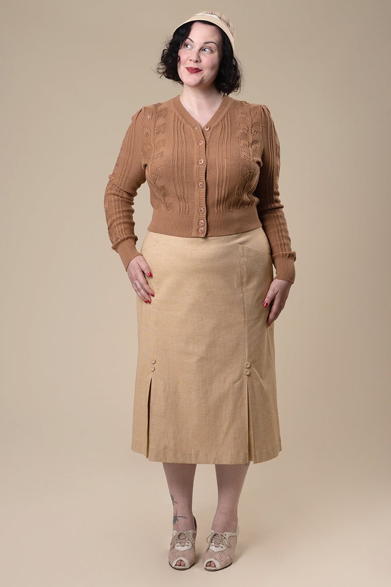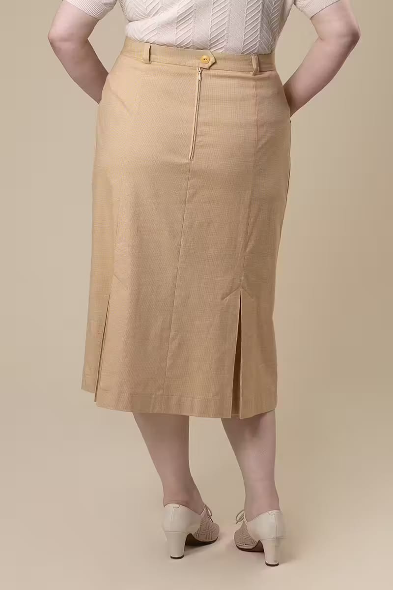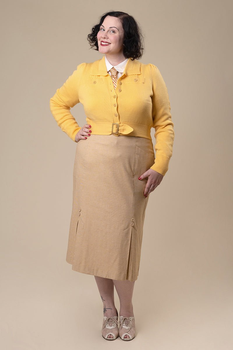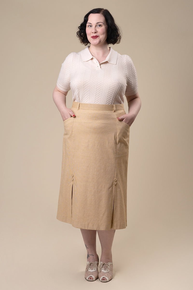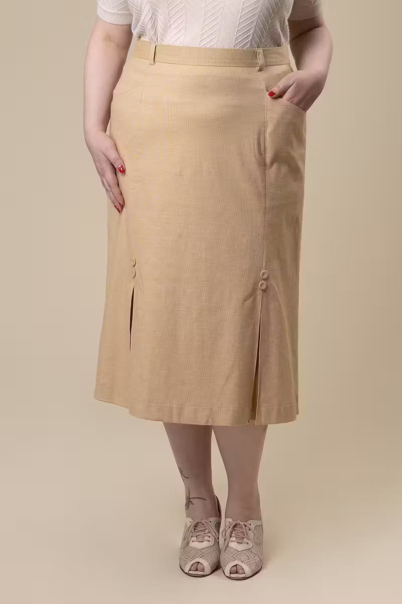 Gefertigt in Litauen aus einem weichen Baumwollstoff mit dreifarbiger Art-Déco-Webung, die aus der Nähe ein dezentes Muster zeigt – aus der Ferne erscheint der Rock in einem warmen, blassen Gelbton. Ein vielseitiges Stück, das sich elegant oder casual stylen lässt – ganz gleich, ob du den 20er- oder 30er-Vibe lebst oder einfach nur Komfort mit Stil suchst.