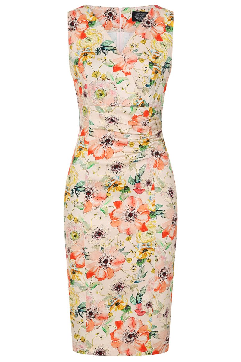 Das Halle Floral Wiggle Dress von Hearts & Roses vereint klassischen 50er-Jahre-Charme mit modernem Tragekomfort. Der feminine V-Ausschnitt und das ärmellose Design betonen die Silhouette, während der figurbetonte Schnitt für einen eleganten Auftritt sorgt. Der elastische Baumwollstoff bietet angenehme Bewegungsfreiheit und passt sich dem Körper perfekt an. Ein rückseitiger Schlitz sorgt zusätzlich für Komfort und eine stilvolle Linienführung. Das florale Muster rundet das Design mit einem Hauch von Romantik ab – ideal für besondere Anlässe und elegante Abende.