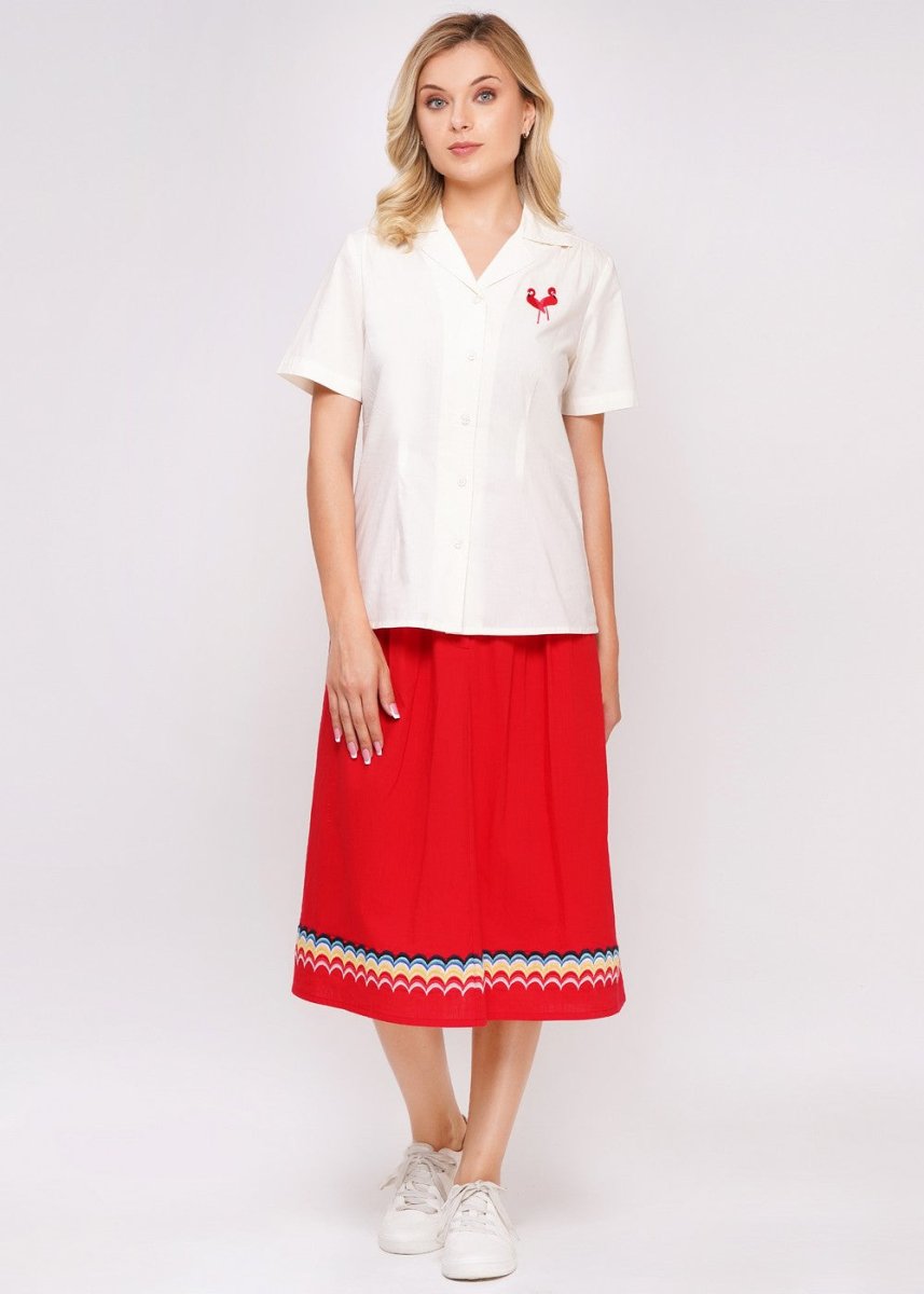Die Bluse Ivory aus 100% Baumwolle mit einem aufgestickten Flamingomotiv von Circus Clothing greift den entspannten Stil klassischer Bowlinghemden auf und verbindet ihn mit einer femininen Silhouette. Ein typisches Merkmal der Bluse ist der Reverskragen und die leicht taillierte Form. Durchgehend geknöpft mit einem kurzen Ärmel mit geradem Abschluss. Laut Hersteller fair produziert in Indien.