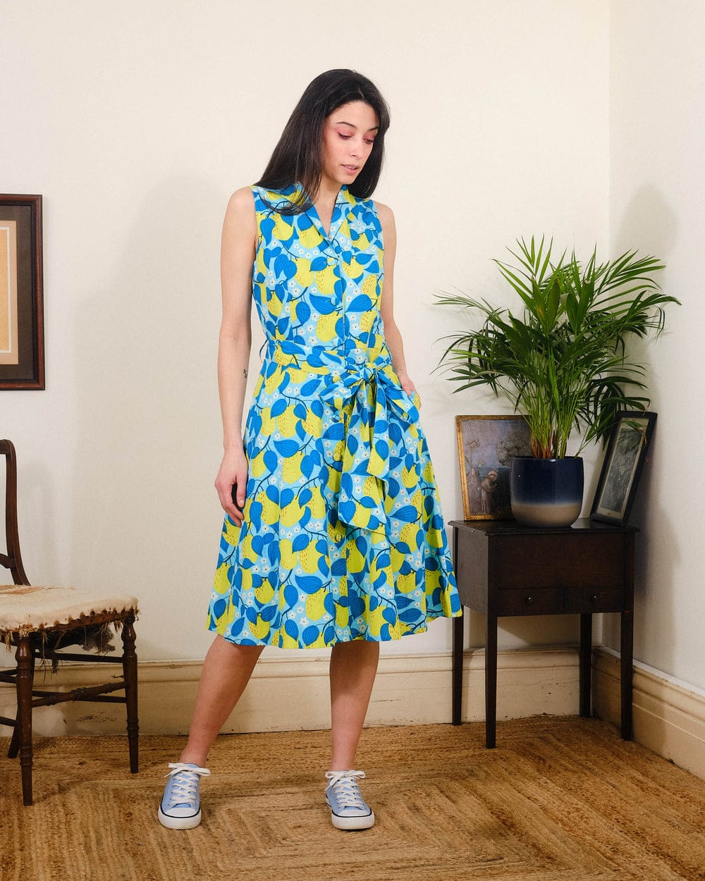 Das Kimberly Dress von Pretty Vacant ist ein verspieltes Sommerkleid mit Schwung und Charme! Der frische Apfelblüten-Print in Blau und Gelb bringt Farbe in deinen Alltag – perfekt für warme Tage mit guter Laune. Der schmeichelhafte Kragen, ein Bindegürtel in der Taille und die durchgehende Knopfleiste sorgen für eine feminine Silhouette und hohen Tragekomfort.