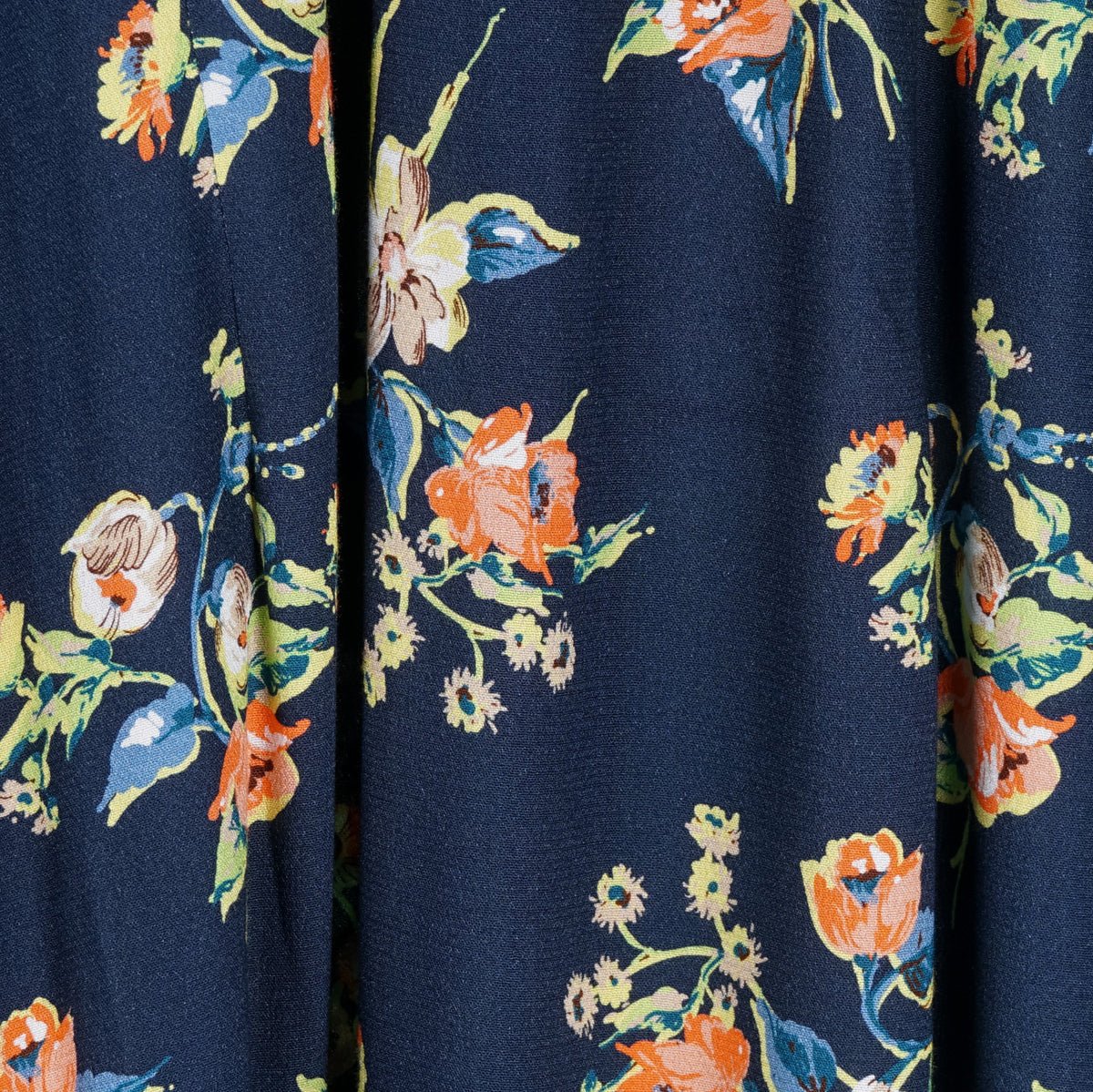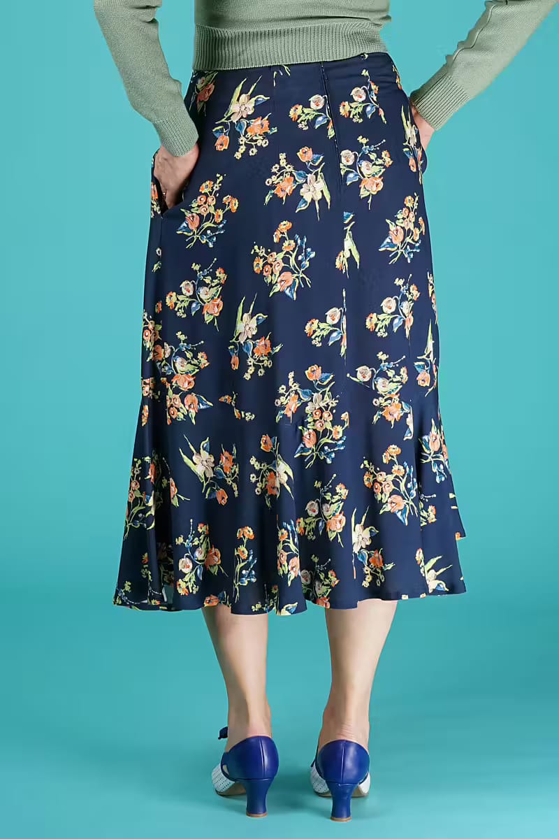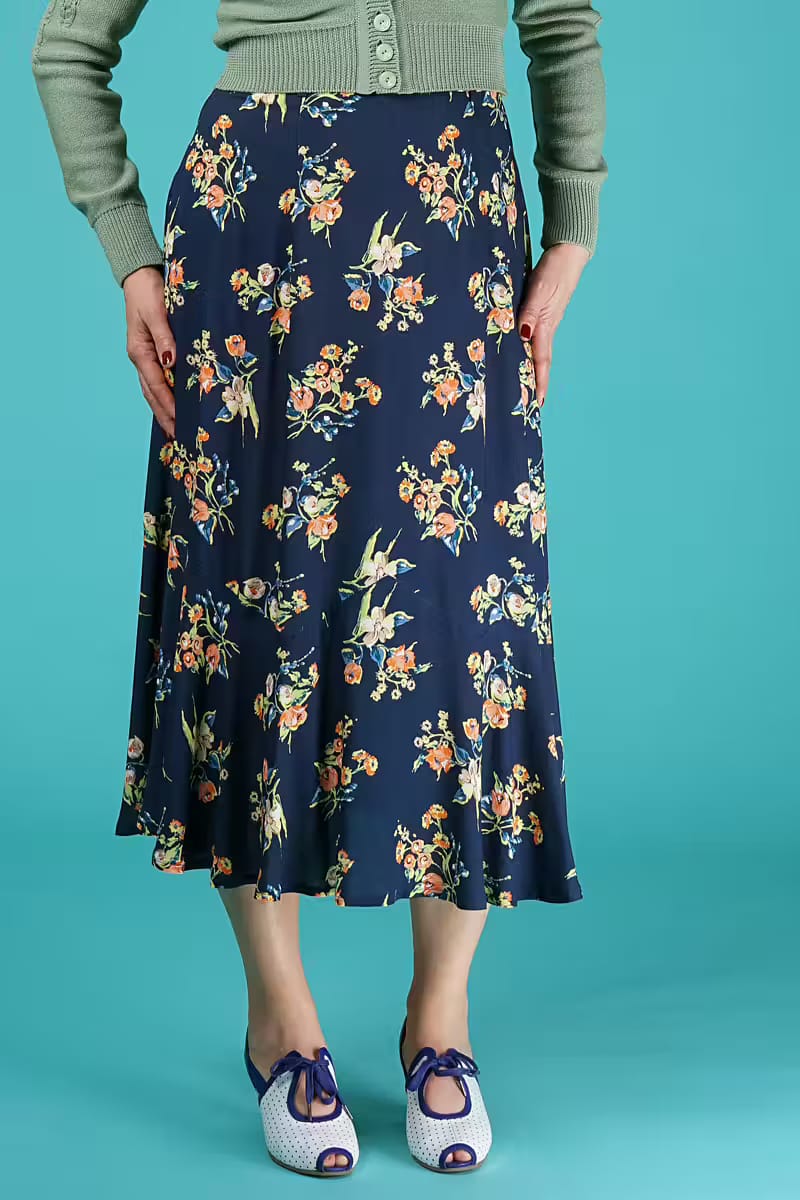 Der Marvelous Midi Skirt verzaubert mit fließendem Fall, eleganter 1930er-Silhouette und einem floralen Art-Déco-Muster auf tiefblauem Hintergrund. Der leichte Crêpe-Stoff sorgt für ein luftiges Tragegefühl – ideal für Frühling und Sommer.