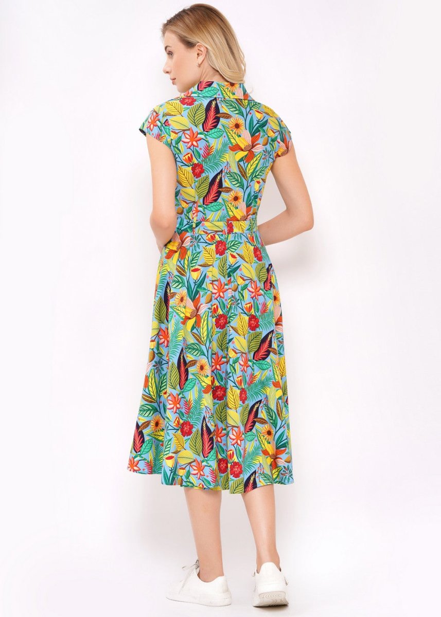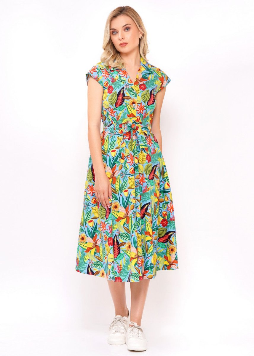 Ein farbenfrohes Kleid von Circus Clothing, das mit seinem lebendigen Muster sofort gute Laune verbreitet. Gefertigt aus 97% Baumwolle und 3% Elastan mit einem Reverskragen, Knopfleiste im Oberteil, seitlichem Reißverschluss, kurzen angeschnittenen Ärmeln und Bindegürtel. Laut Hersteller fair produziert in Indien.