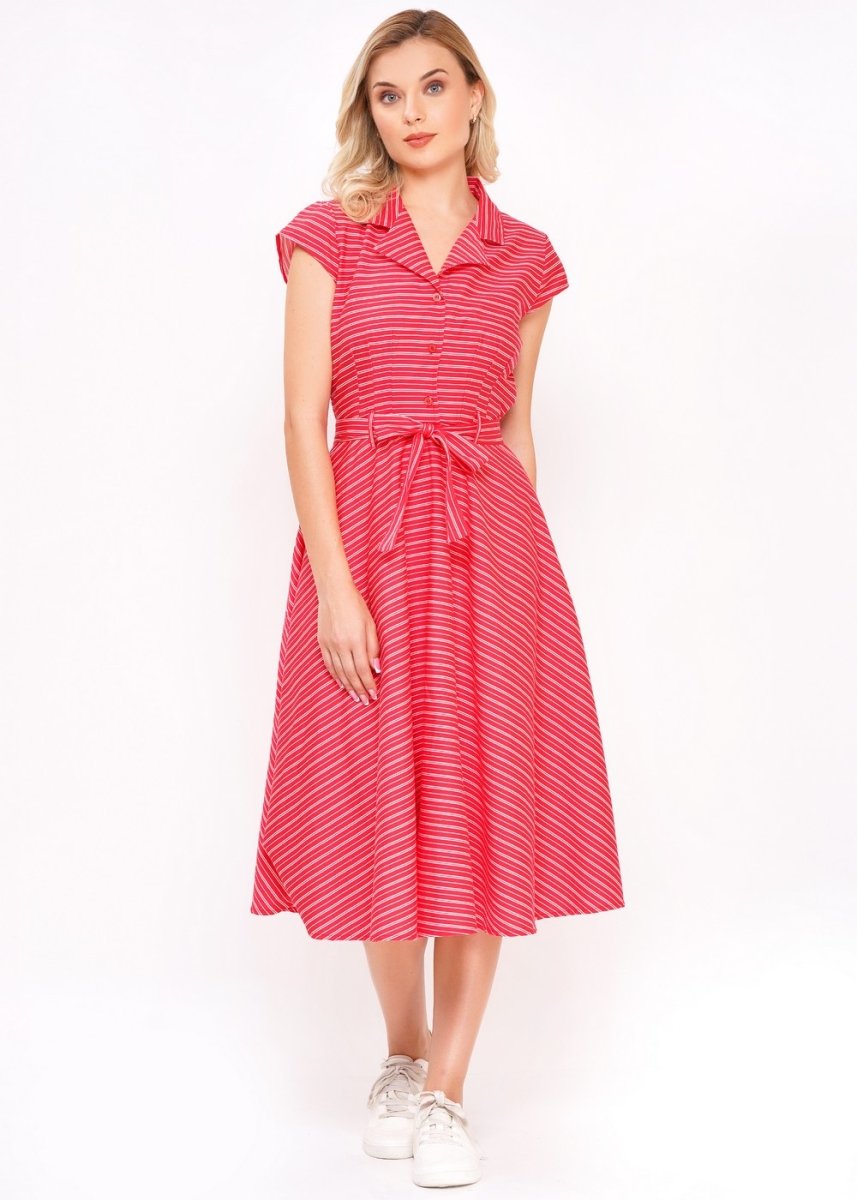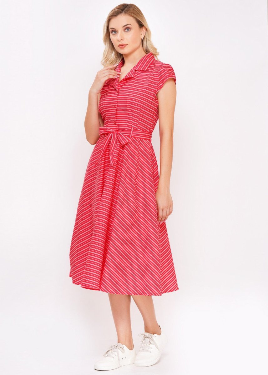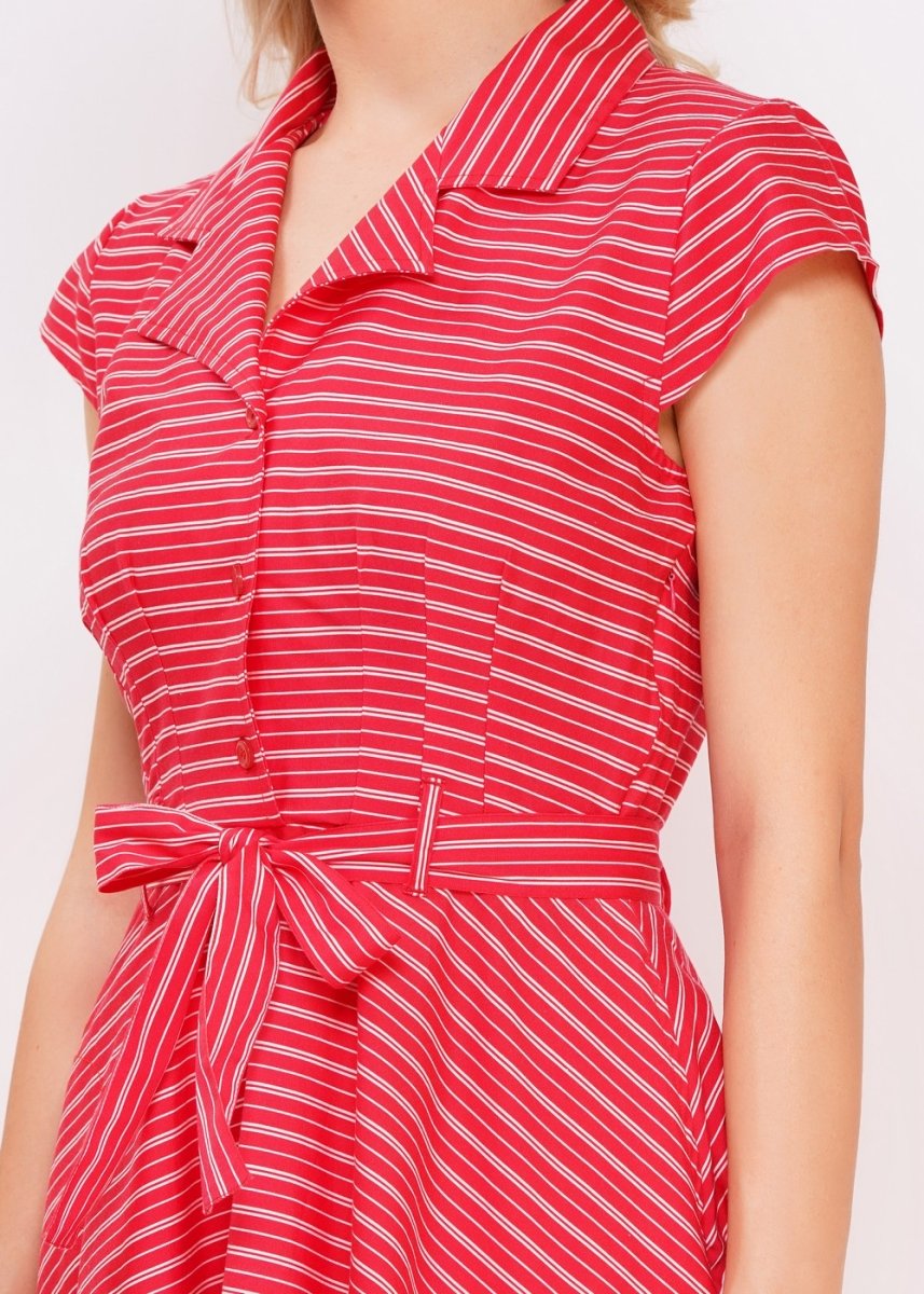 Das Pinstripe Dress mit seitlichen Eingriffstaschen von Circus Clothing aus 97% Baumwolle und 3% Elastan, ist ein zeitloser Klassiker, den du vielseitig kombinieren kannst. Reverskragen, kurze angeschnittene Ärmel und Knopfleiste im Oberteil. Seitlicher Reißverschluss und Bindegürtel. Laut Hersteller fair produziert in Indien.
