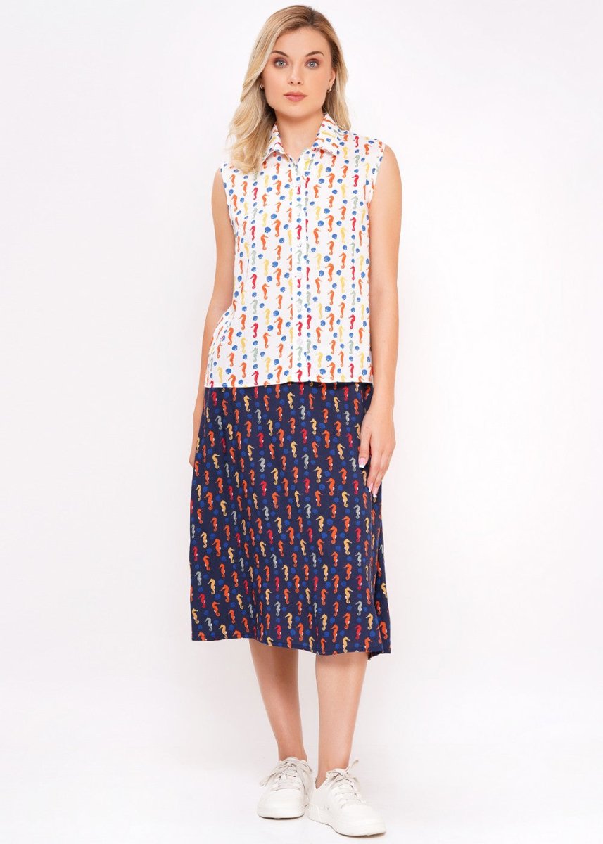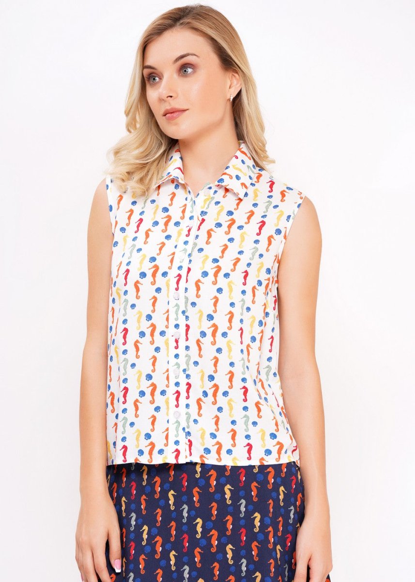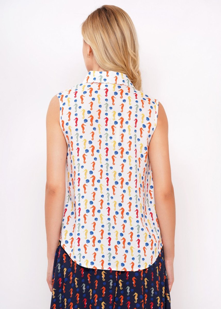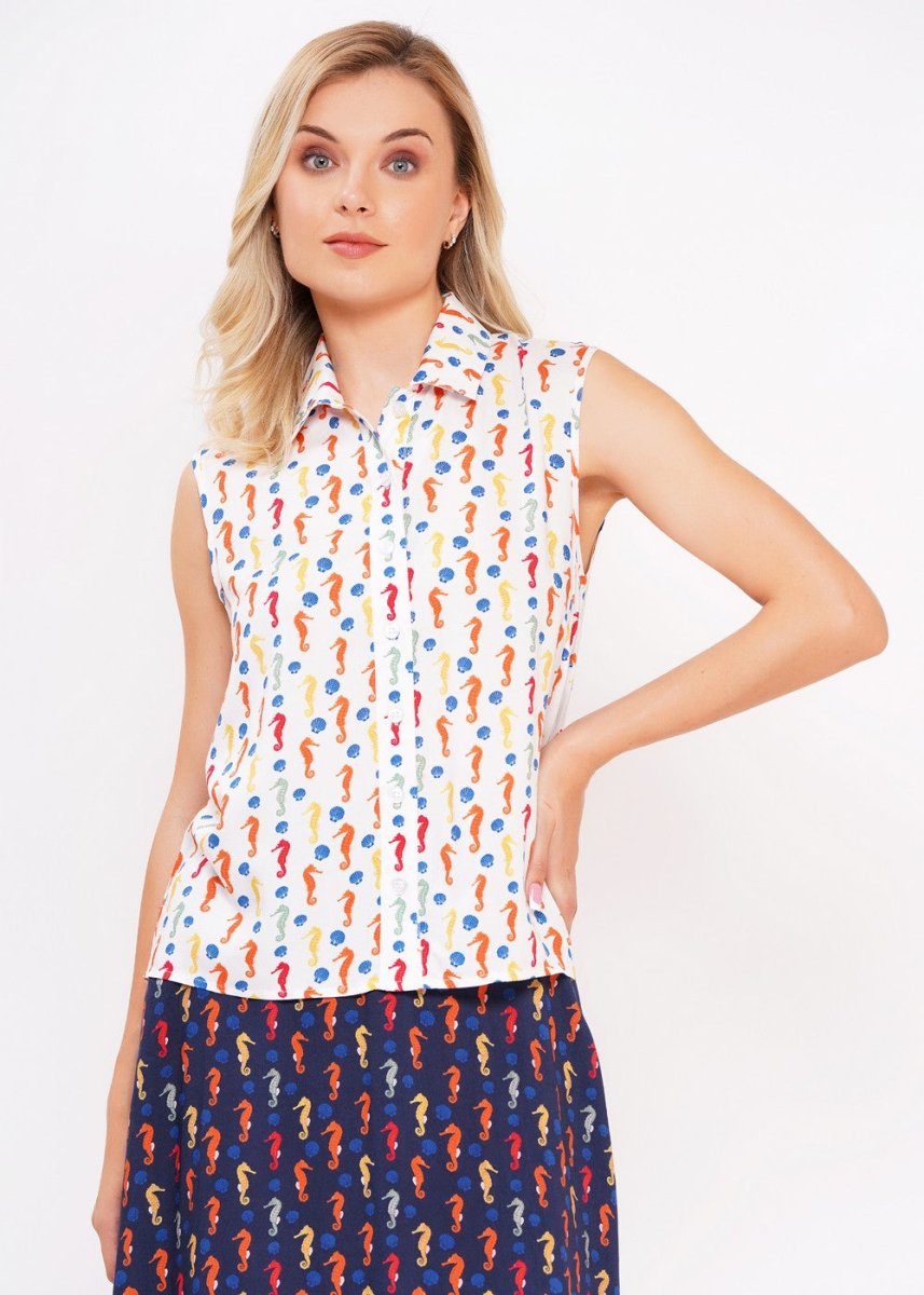 Die Ärmellose ivory farbene Bluse mit einem Hemdblusenkragen und einer durchgehenden Knopfleiste besticht durch den bunten und frechen Seepferdchenprint. Gefertigt aus 100% Viskose. Laut Hersteller fair produziert in Indien.
