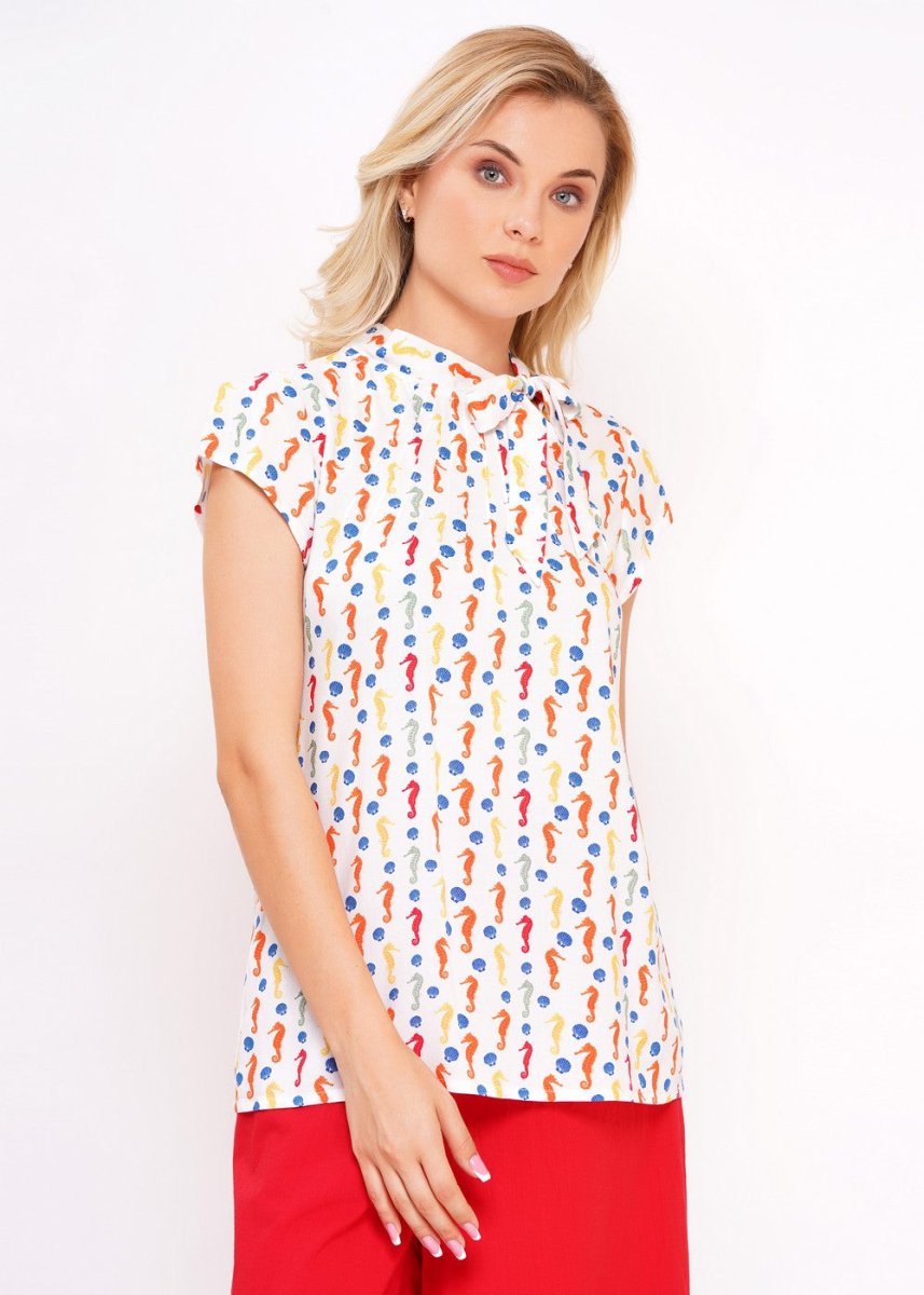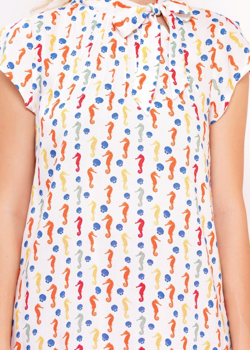 Die Schleifenbluse Seahorse in ivory aus 100% Viskose von Circus Clothing setzt mit seinem sommerlich bunten Seepferdchenmuster einen Akzent! Sie besticht durch einen hohen Tragekomfort mit einer leicht taillierten Form und kurzen angeschnittenen Ärmeln. Ein absoluter Hingucker ist der Rundhalsausschnitt mit Schleifenband. Laut Hersteller fair produziert in Indien.