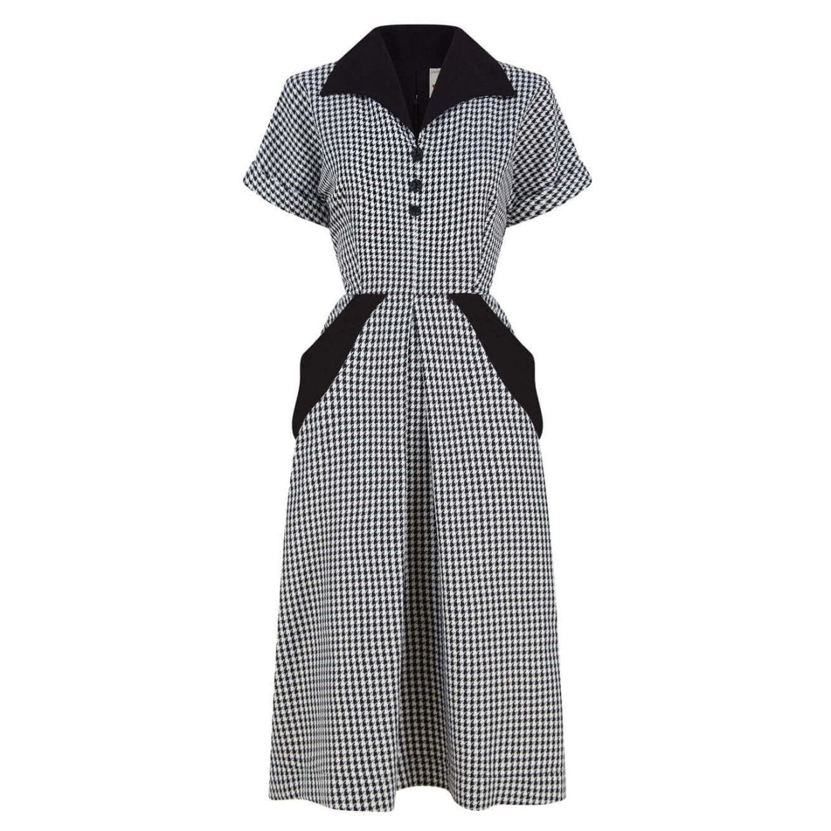 Erlebe den Glamour der 1940er- und 50er-Jahre mit dem wunderschönen Sophia Kleid von Weekend Doll. Gefertigt aus stilvollem Viskose-Mix im klassischen Hahnentrittmuster, vereint es Vintage-Charme mit durchdachten Details wie dekorativen Knöpfen, kontrastierendem Kragen und praktischen Seitentaschen. Der ausgestellte Rock mit invertierter Falte fällt bis über das Knie und sorgt für eine authentische Silhouette im Retro-Stil. Das Kleid lässt sich mit oder ohne Bindegürtel tragen und ist ideal für verschiedenste Anlässe.