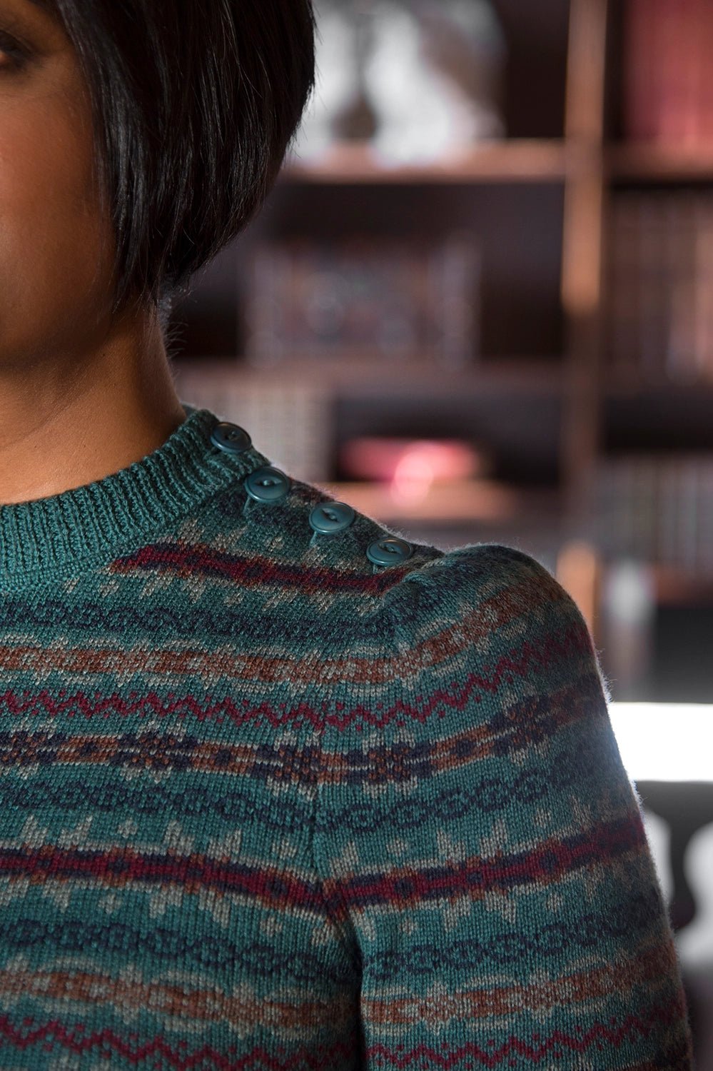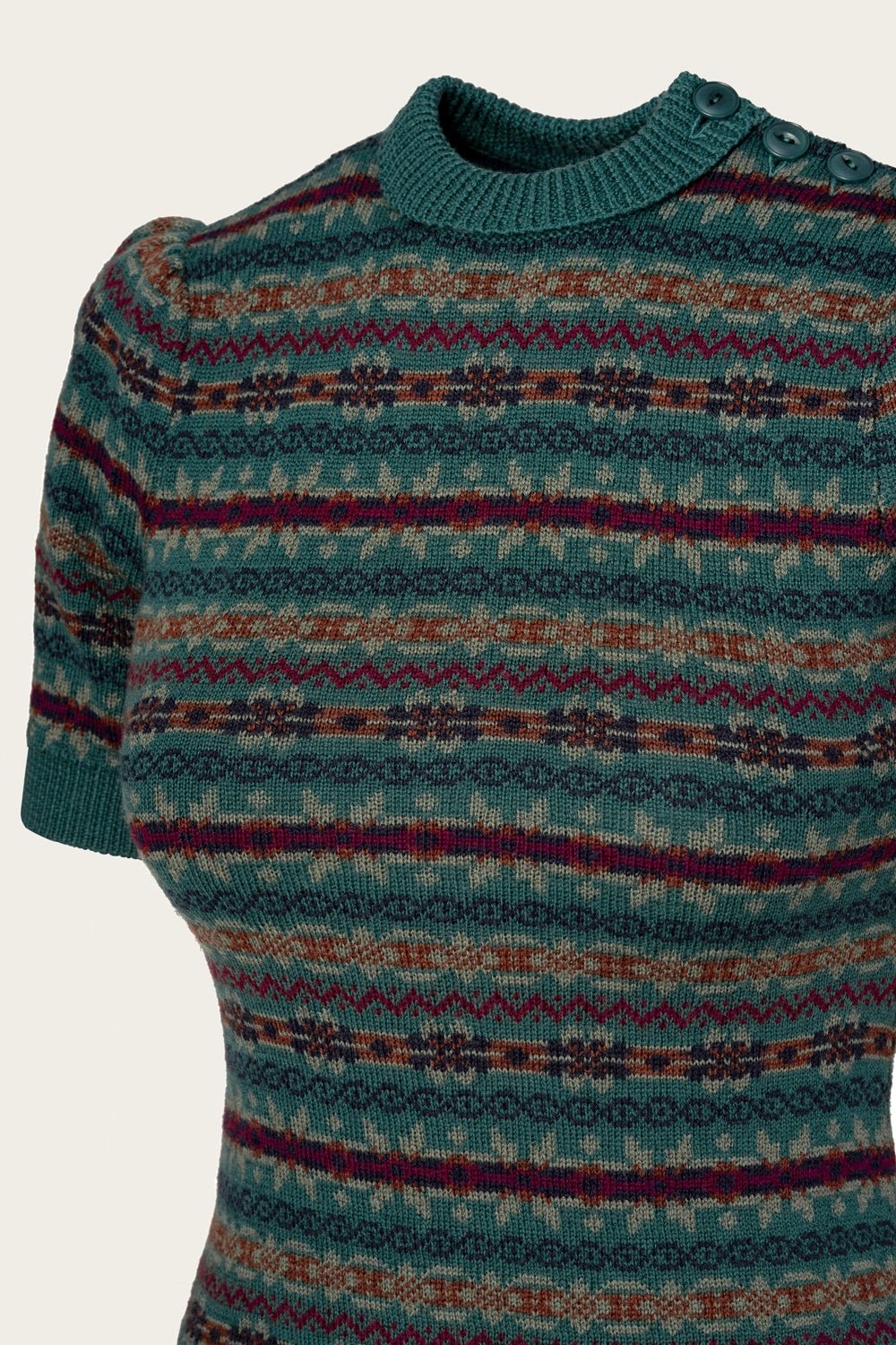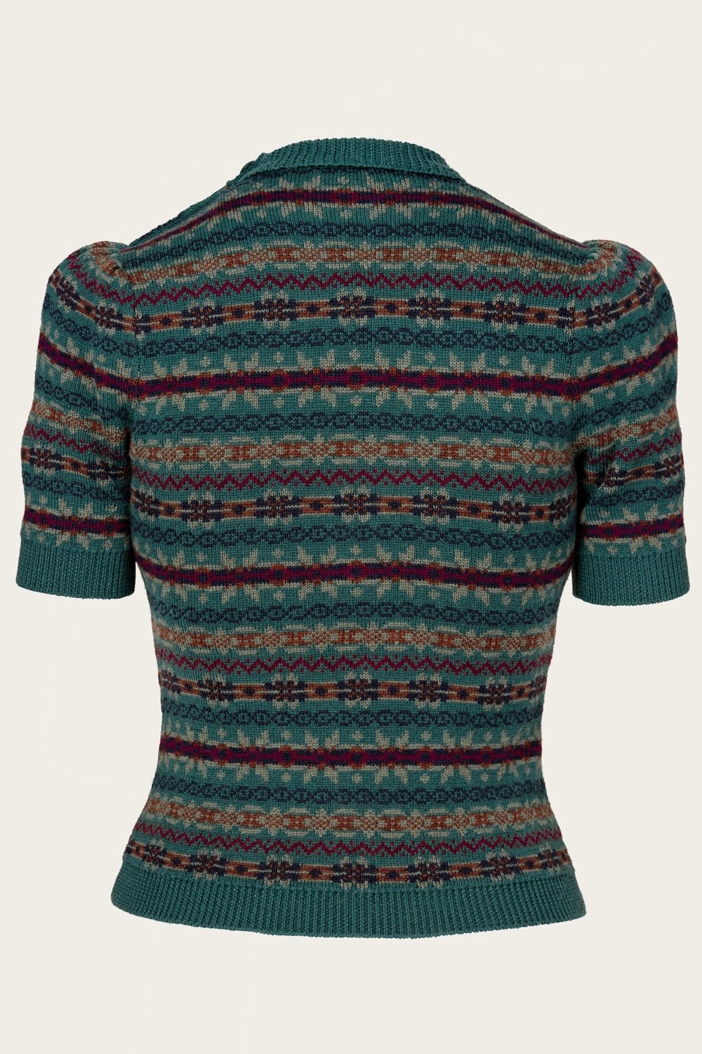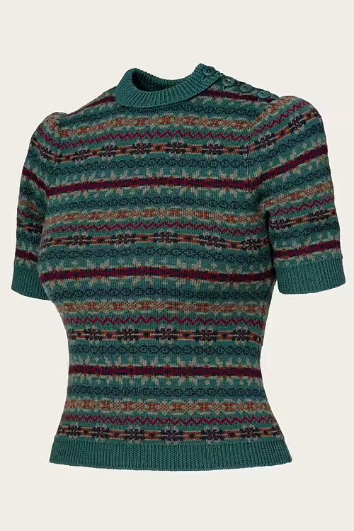 Das Stricktop The Fairest Knit Top von Emmy Design ist inspiriert von den 1930er- und 1940er-Jahren. Es zeigt sich mit Puffärmeln, kleinem Rollkragen und Knöpfen an der Schulter. Das dichte Jacquardstrickmuster macht es angenehm warm, während das bunte Fair-Isle-Muster in Blau, Grün, Braun und Pflaume für den klassischen Vintage-Charme sorgt. Ob in die Hose gesteckt oder locker getragen – dieses Stricktop ist vielseitig kombinierbar und verleiht jedem Outfit einen besonderen Akzent.