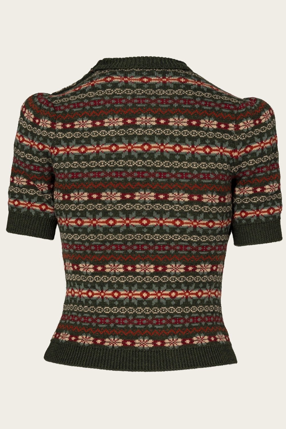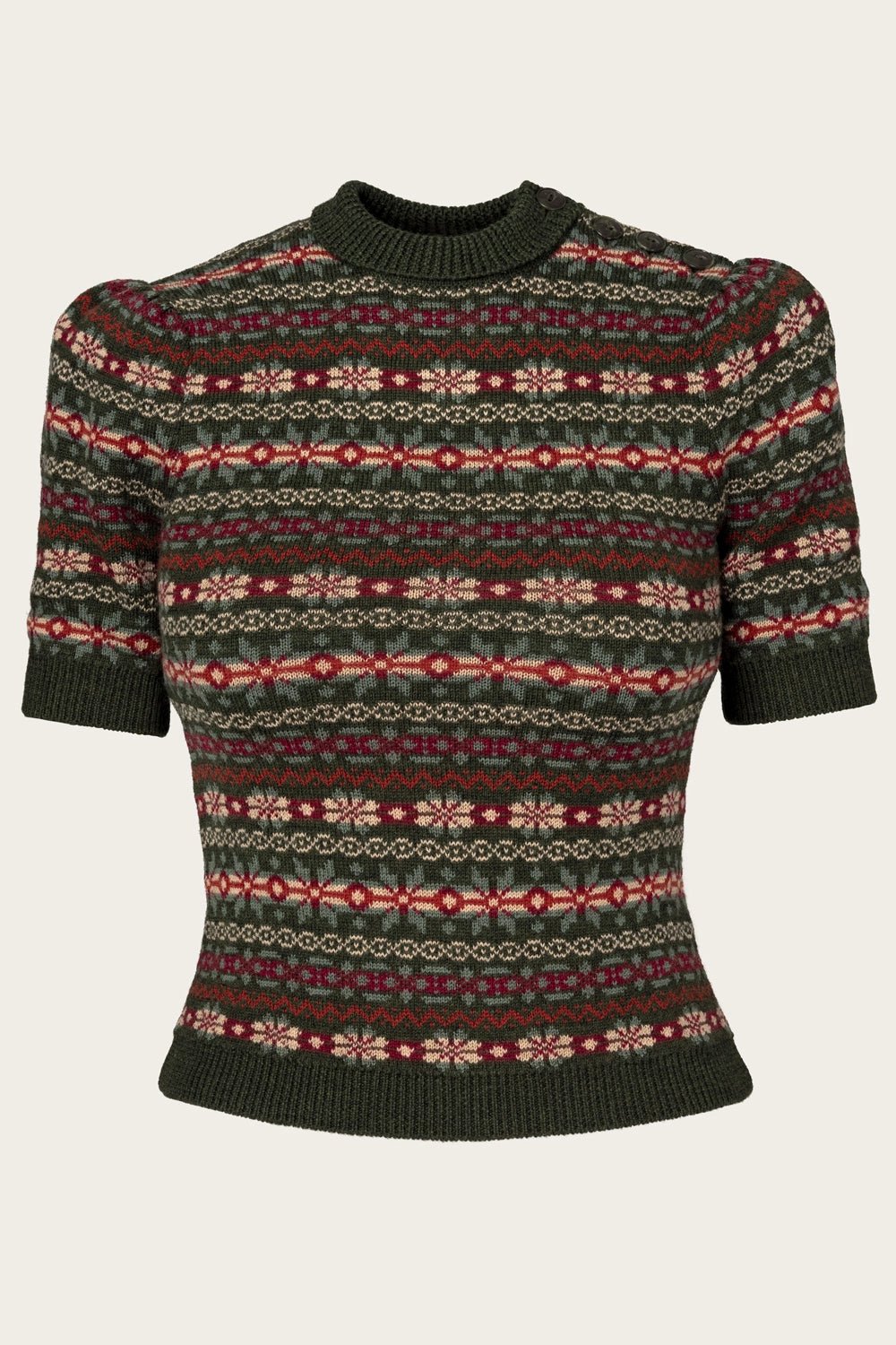 Das Stricktop The Fairest Knit Top von Emmy Design aus piniengrün melierter Wolle zeigt sich im traditionellen Fair-Isle-Strickmuster. Mit Puffärmeln, niedrigem Rollkragen und dekorativen Knöpfen auf der Schulter ist es ein echtes Vintage-Highlight. Das Modell ist lang genug, um es in die Hose zu stecken, kann aber auch locker getragen werden. Durch das dichte Jacquard-Muster hält es angenehm warm und lässt sich vielseitig kombinieren – vom klassischen Retro-Look bis zum modernen Outfit mit Jeans.