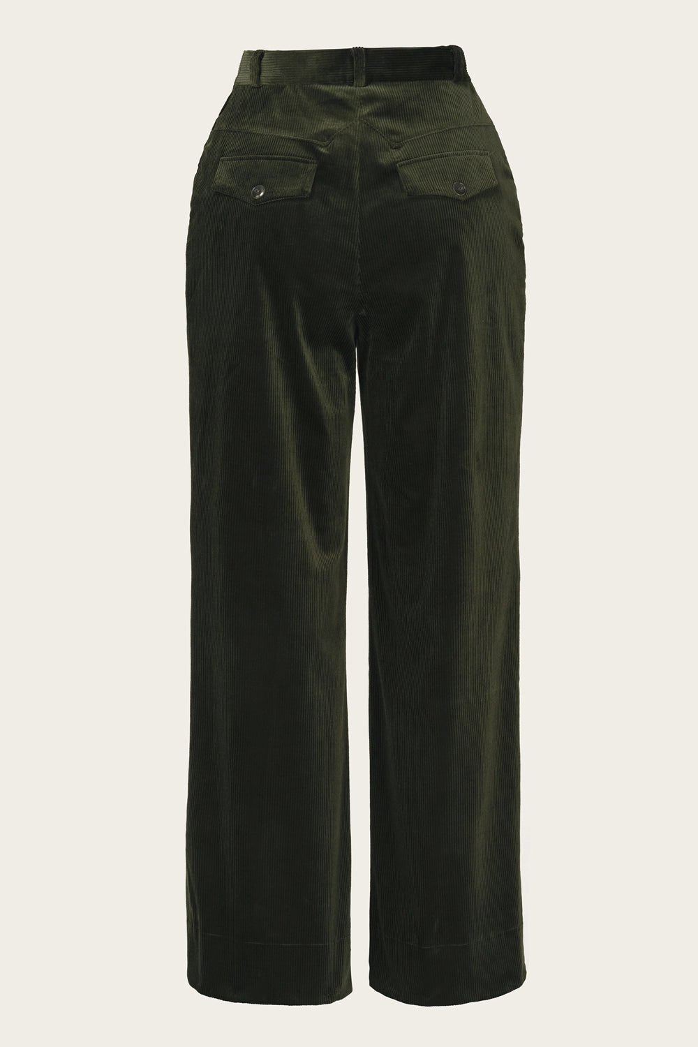 Die Fancy Worker Pants aus waldgrünem Cord sind eine klassische Damenhose im weniger hohen Bundschnitt als die Miss-Fancy-Pants Slacks. Sie haben tief eingesetzte, schräge Seitentaschen, verdeckte Knöpfe für Hosenträger und dekorative Pattentaschen am Rücken, die die Figur schmeichelhaft betonen.