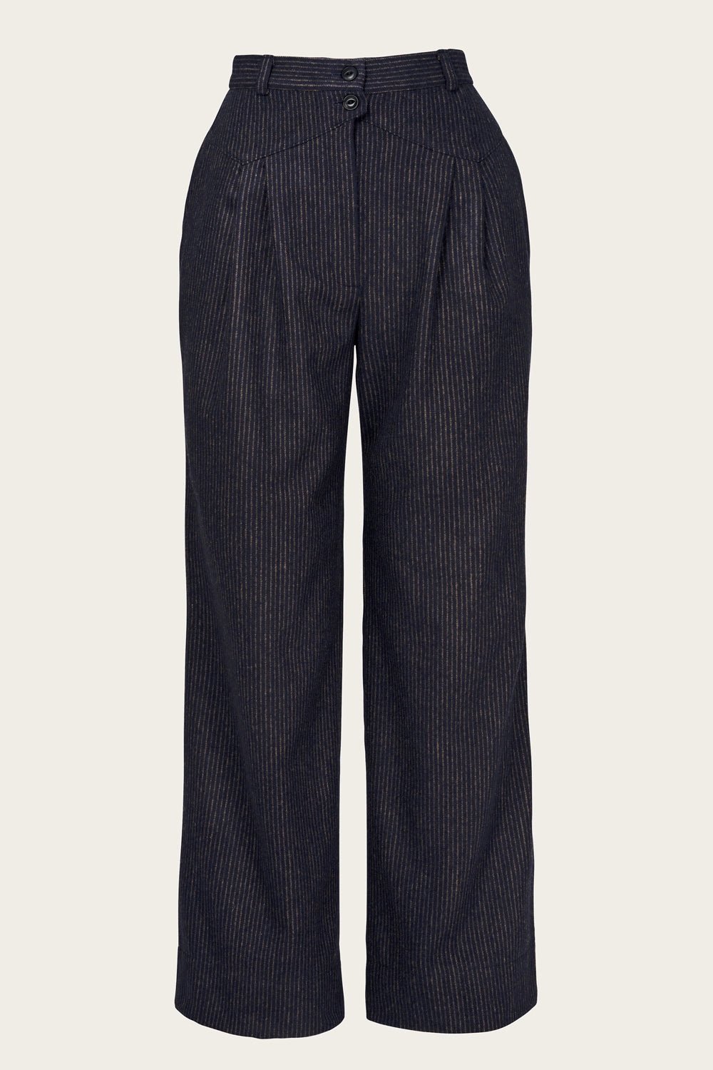 Die Fancy Worker Pants in navy mit braunen Nadelstreifen sind eine klassische Damenhose im weniger hohen Bundschnitt als die Miss-Fancy-Pants Slacks. Sie haben tief eingesetzte, schräge Seitentaschen, verdeckte Knöpfe für Hosenträger und dekorative Pattentaschen am Rücken, die die Figur schmeichelhaft betonen.