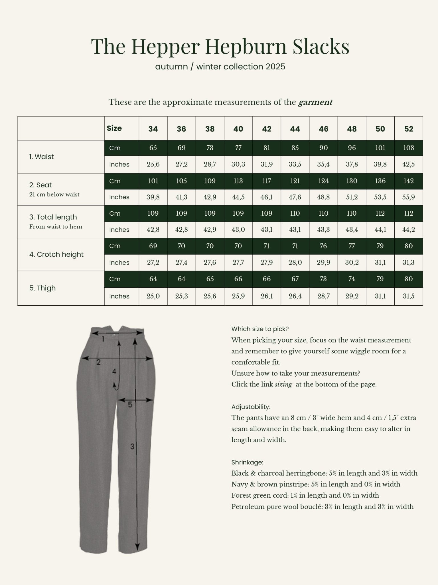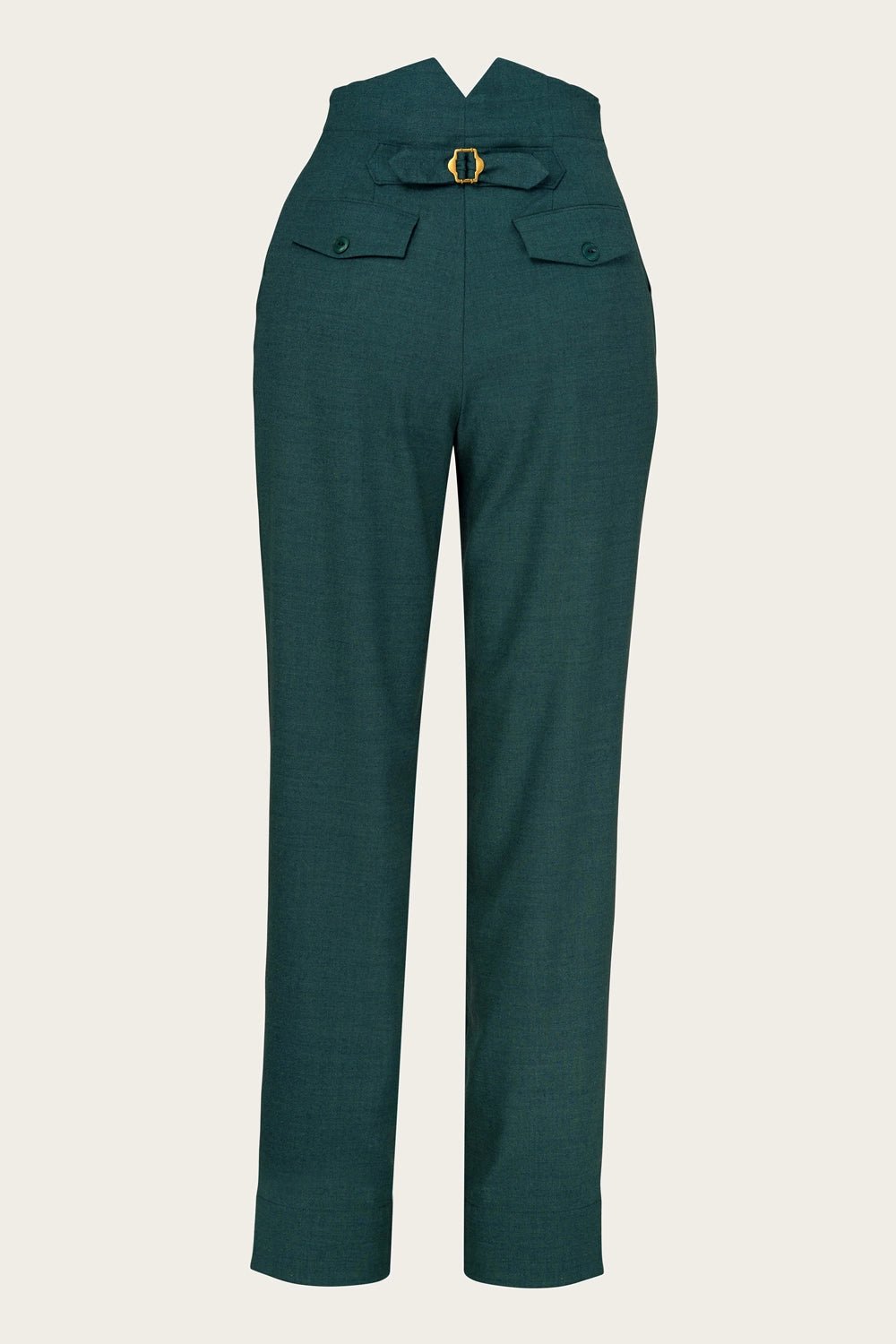 Die Hepper Hepburn Slacks aus petrolfarbenem Woll-Bouclé sind klassische Damenhosen mit hohem Bund und schmal zulaufenden Beinen. Sie lassen sich mit oder ohne Hosenträger zu jedem Oberteil kombinieren. Der Bund ist innen mit Knöpfen für Hosenträger versehen, die Rückenpartie mit Zierpaspeltaschen und einer Schnalle betont die Taille. Neu ist ein etwas schmalerer Bund und eine verbesserte Passform für noch mehr Tragekomfort.