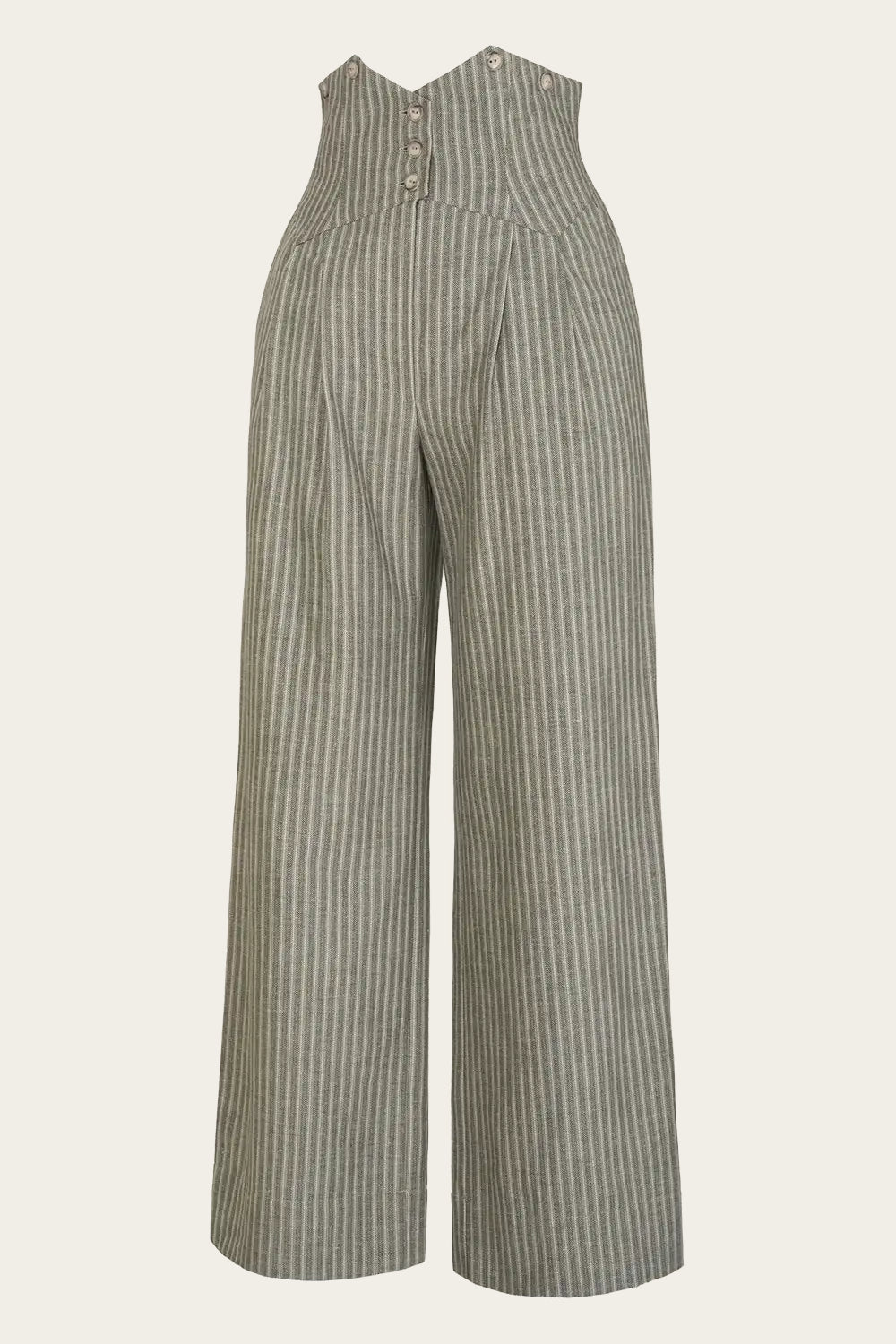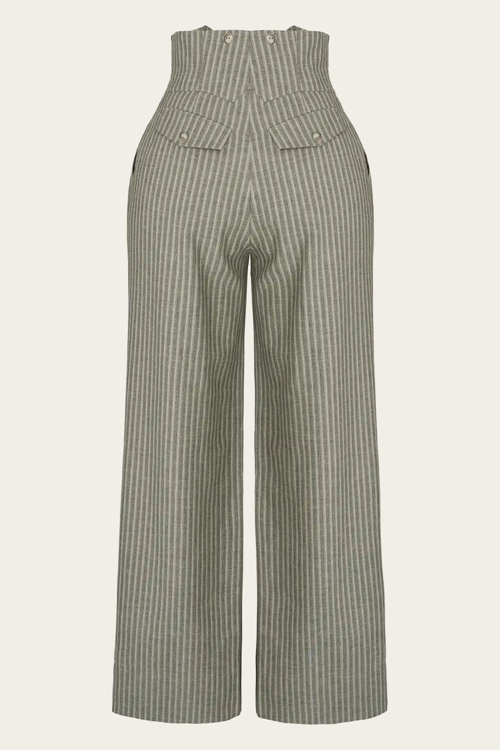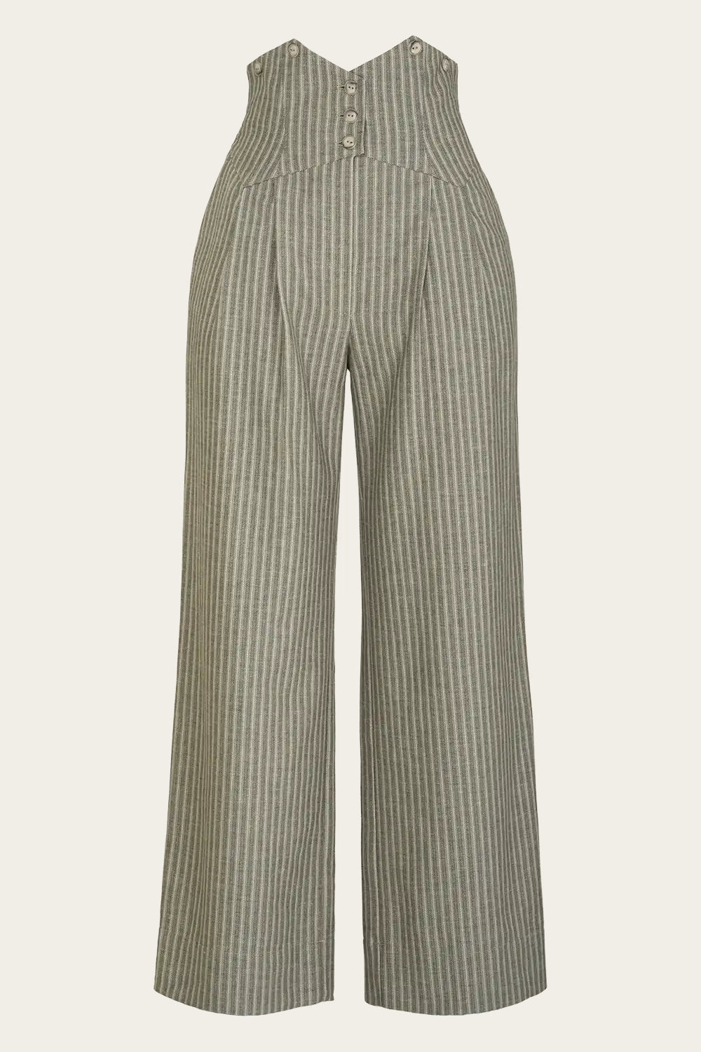Unsere absoluten Signature Pants sind zurück in einer Frühjahr und Sommer Version. Mit extra hohem Bund, geradem Bein und schwingender Passform sowie Knöpfen für Hosenträger und praktischen Taschen tragen sie eine gute Portion Peaky Blinders Flair in sich. Der weiche, strukturierte Stoff mit leichtem Leinenanteil zeigt eine erdige Fischgratbindung mit Streifen in Waldgrün, Salbeigrün, Weiß und Sand. Das Material stammt aus Italien, das Taschenfutter aus Spanien, gefertigt wird das Kleidungsstück in Litauen.