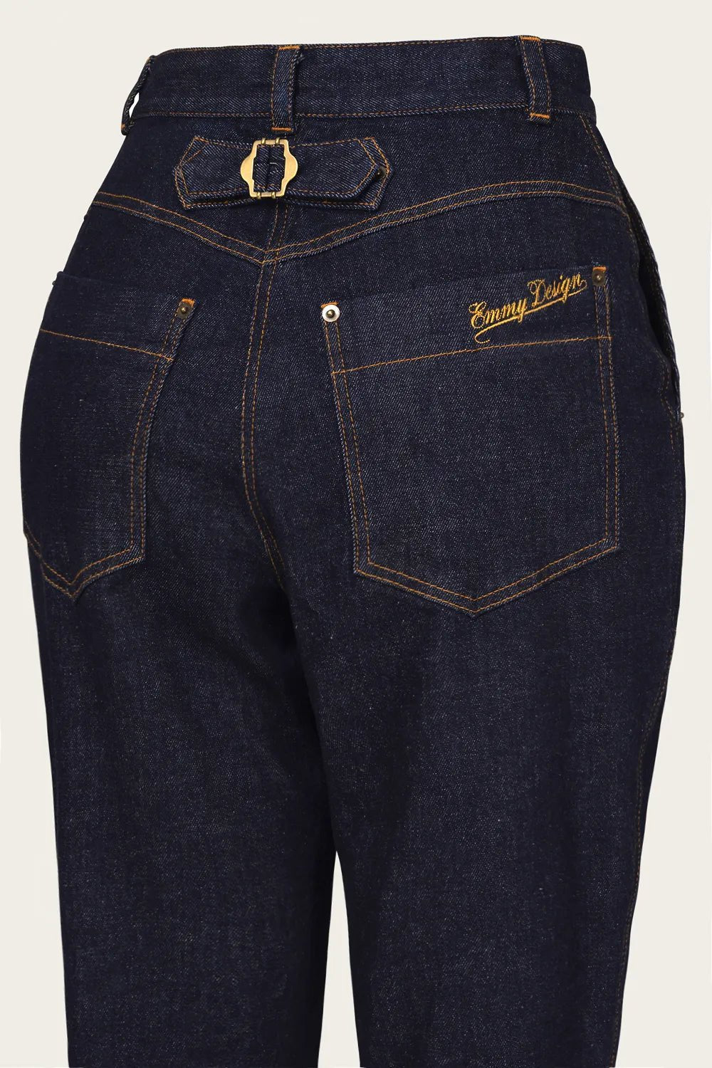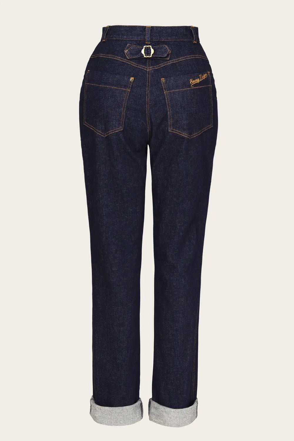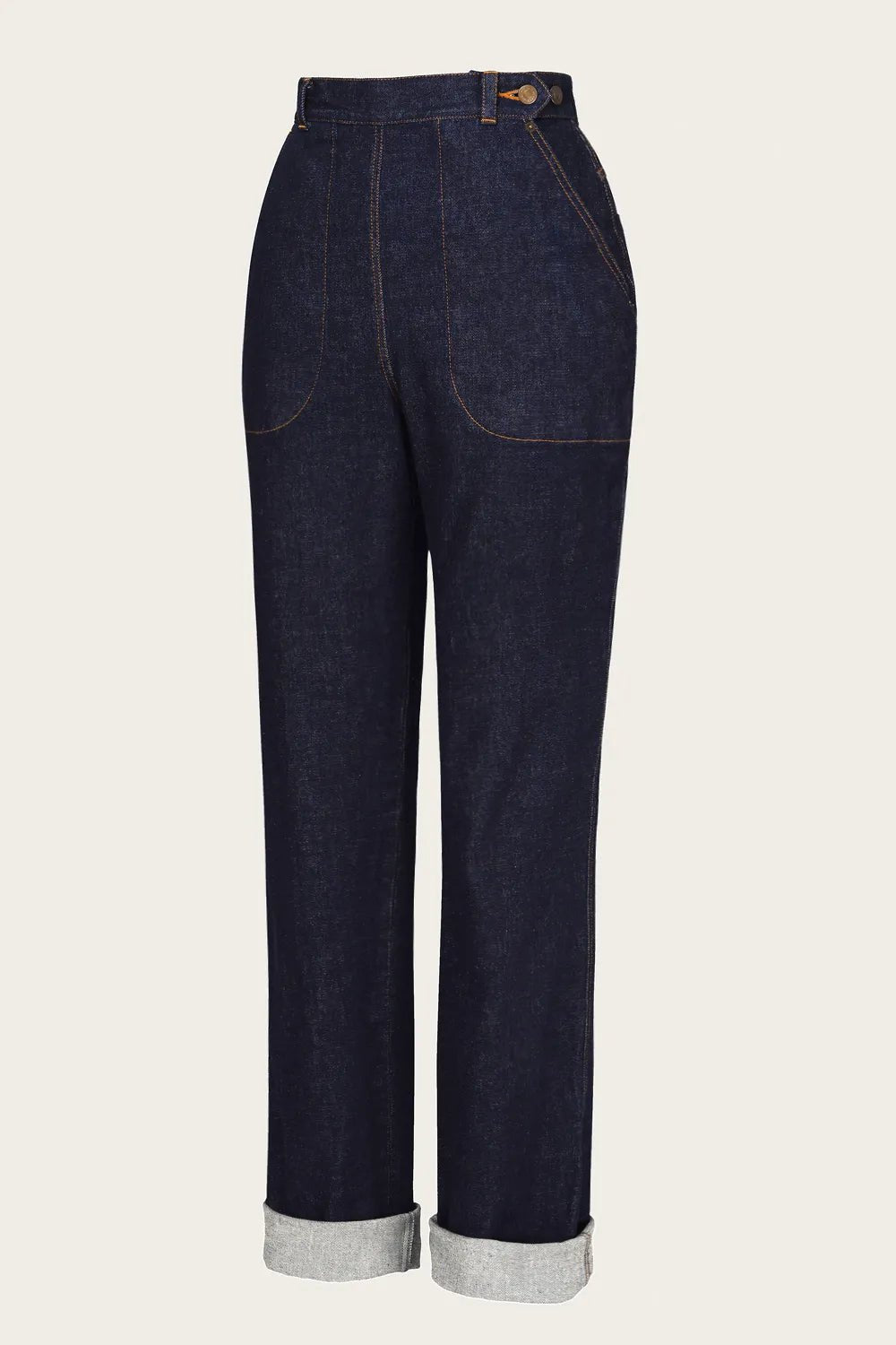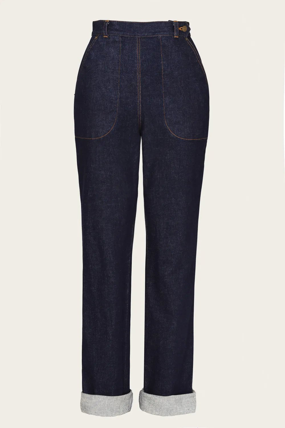 Die Norma Jean Jeans aus Bio-Denim sind inspiriert von klassischen 1950er-Worker-Jeans. Gefertigt aus schwerem Raw Denim mit Stretch, bieten sie Komfort und eine authentische Vintage-Optik. Details wie ockergelbe Ziernähte, antike Messingknöpfe, eine Schnalle am Rücken und tiefe Taschen machen sie besonders. Typisch für Damenjeans der Zeit verbirgt die linke Tasche den Reißverschluss. Extra lange Beine ermöglichen den charakteristischen 50’s Turn-up.