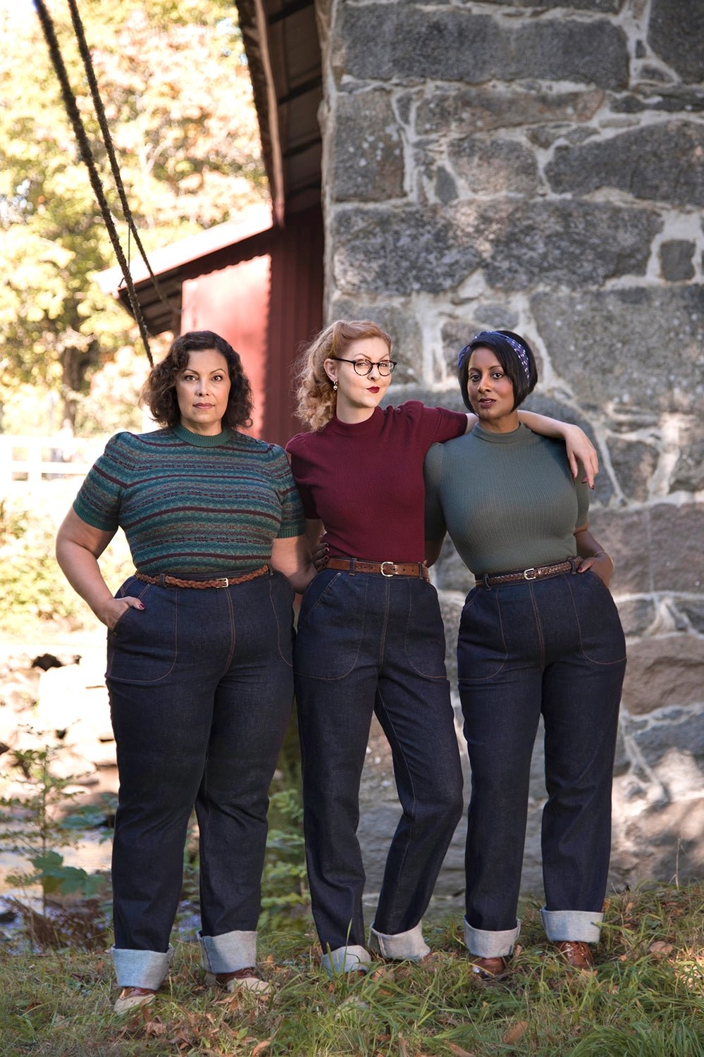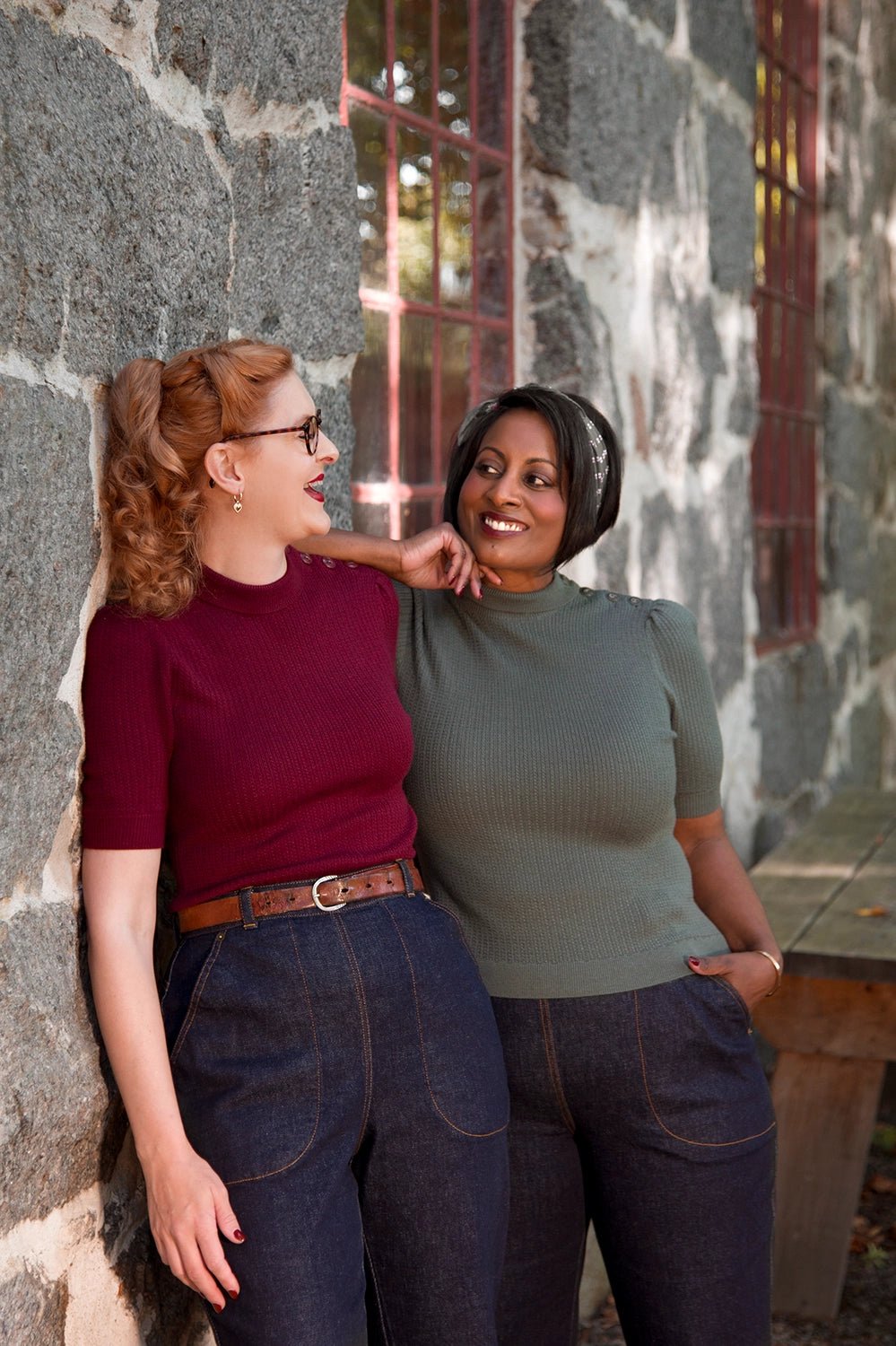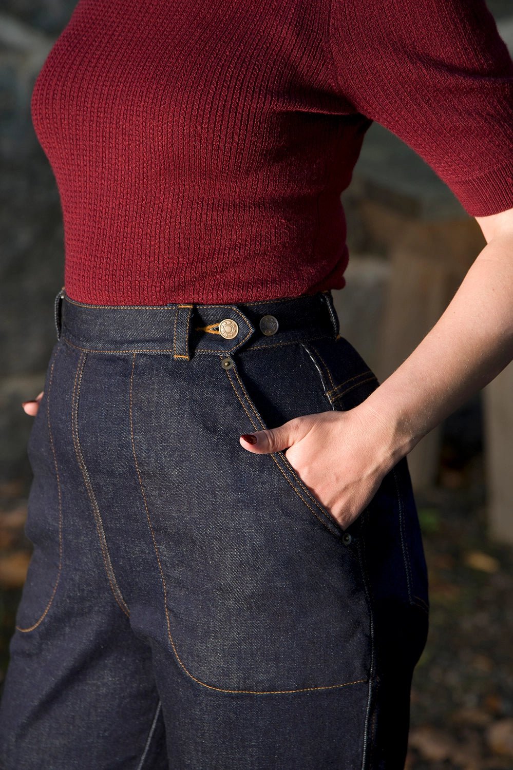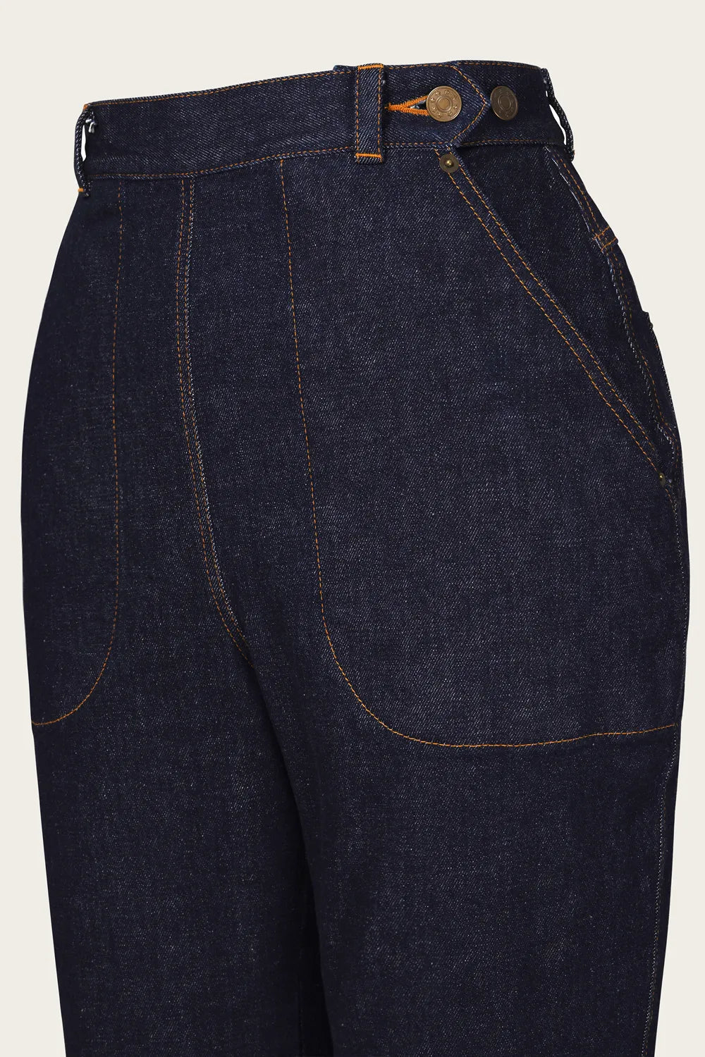Die Norma Jean Jeans aus Bio-Denim sind inspiriert von klassischen 1950er-Worker-Jeans. Gefertigt aus schwerem Raw Denim mit Stretch, bieten sie Komfort und eine authentische Vintage-Optik. Details wie ockergelbe Ziernähte, antike Messingknöpfe, eine Schnalle am Rücken und tiefe Taschen machen sie besonders. Typisch für Damenjeans der Zeit verbirgt die linke Tasche den Reißverschluss. Extra lange Beine ermöglichen den charakteristischen 50’s Turn-up.