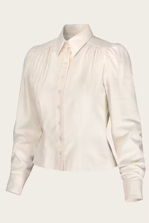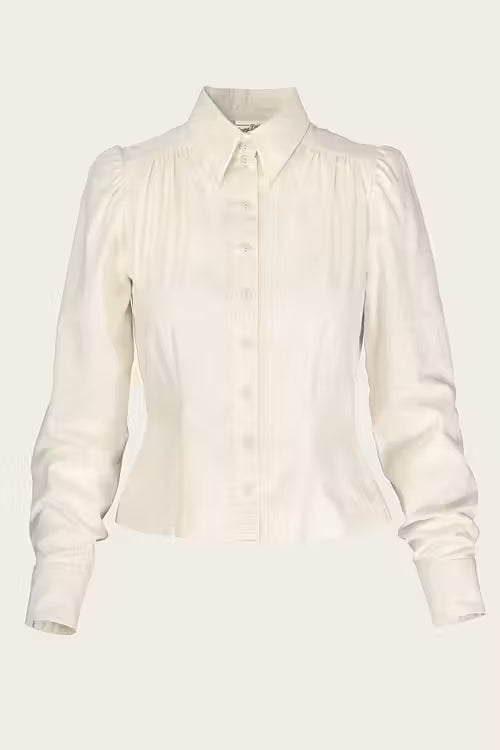 Das Spectacular Spearpoint Shirt aus antique-weißer Baumwolle ist ein klassisches Damenshirt mit markantem Spearpoint-Kragen. Es kann sowohl elegant mit Krawatte und Weste als auch leger offen getragen werden. Die Passe mit Kräuselungen vorne und hinten sorgt für Bewegungsfreiheit und einen femininen Touch.