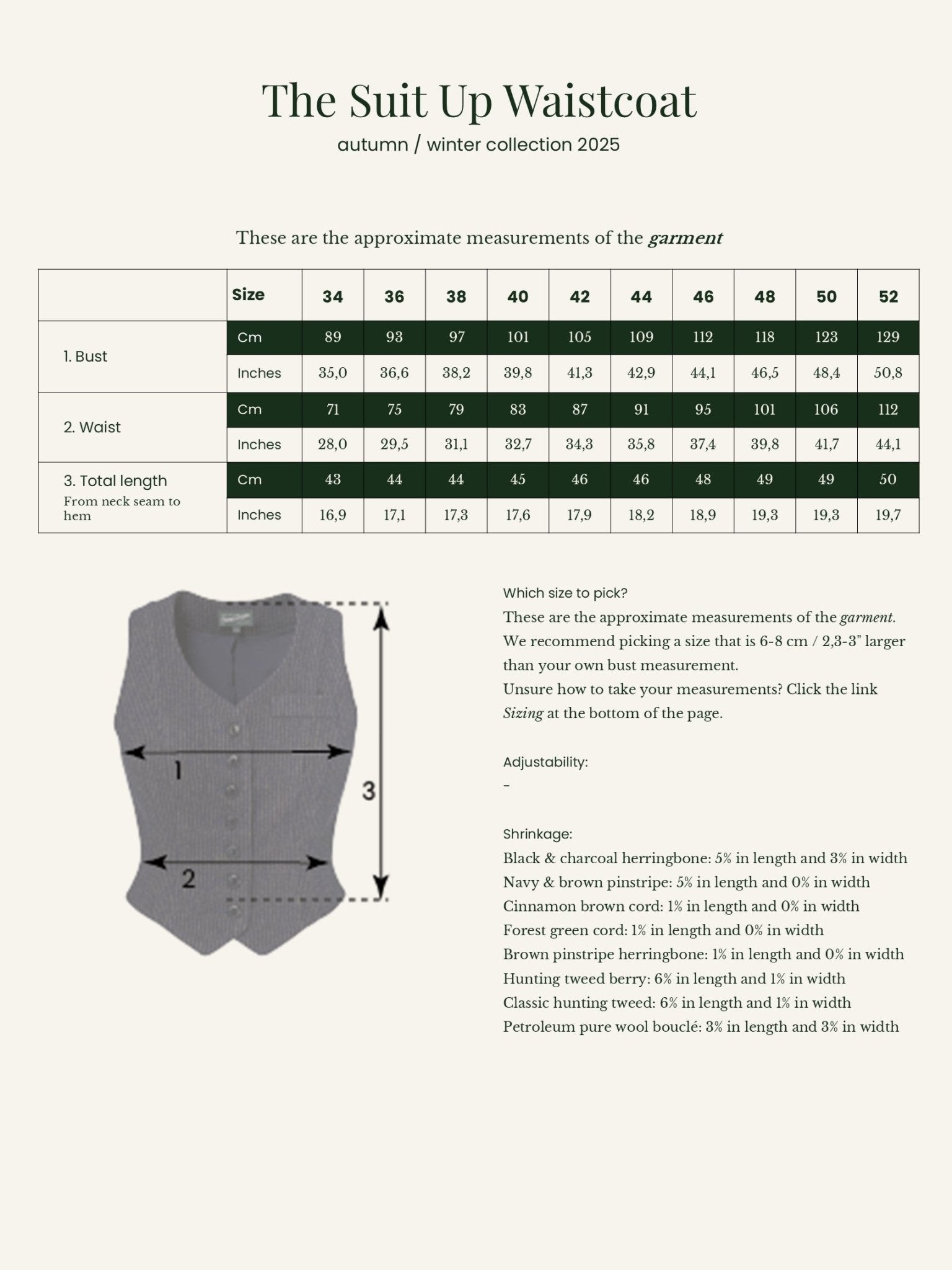 Die Suit Up Waistcoat aus waldgrünem Cord ist eine klassische Damenweste im klaren Schnitt mit einer Knopfreihe. Sie ist vielseitig kombinierbar mit Röcken und Hosen und komplett gefüttert.