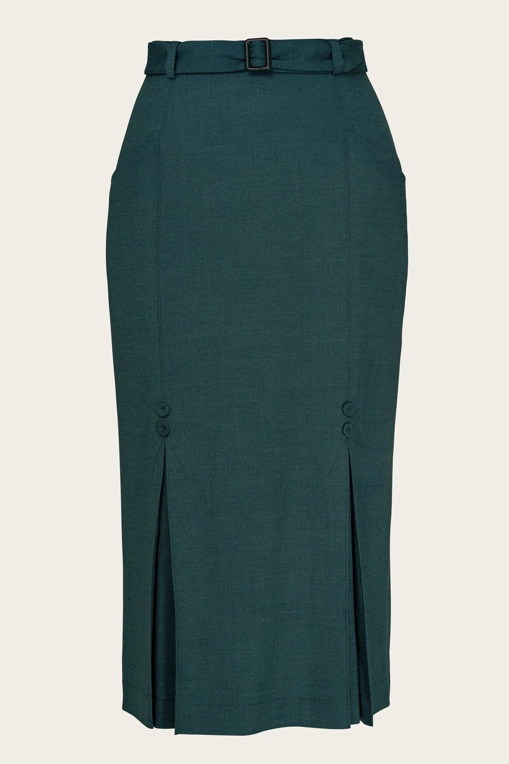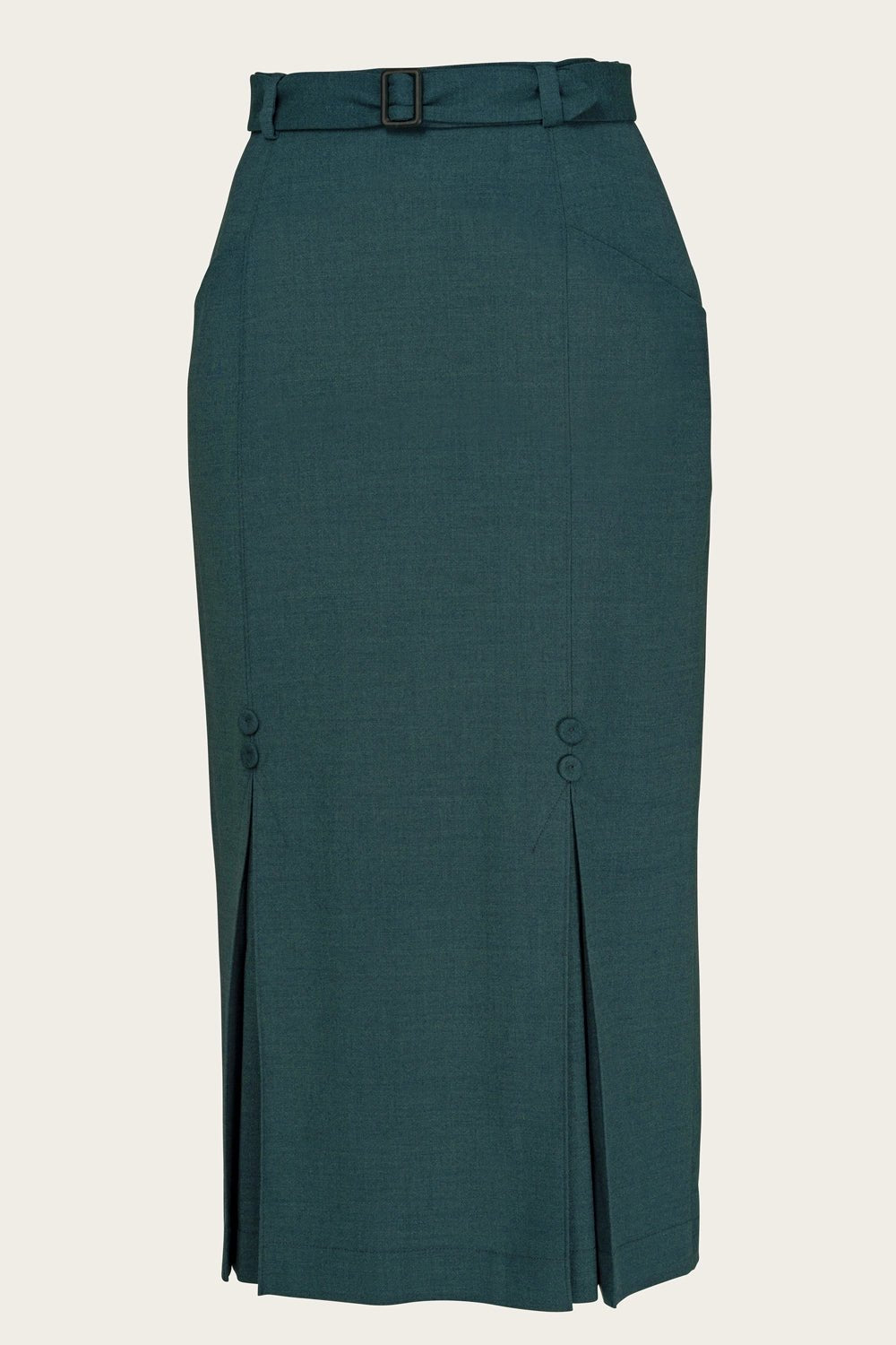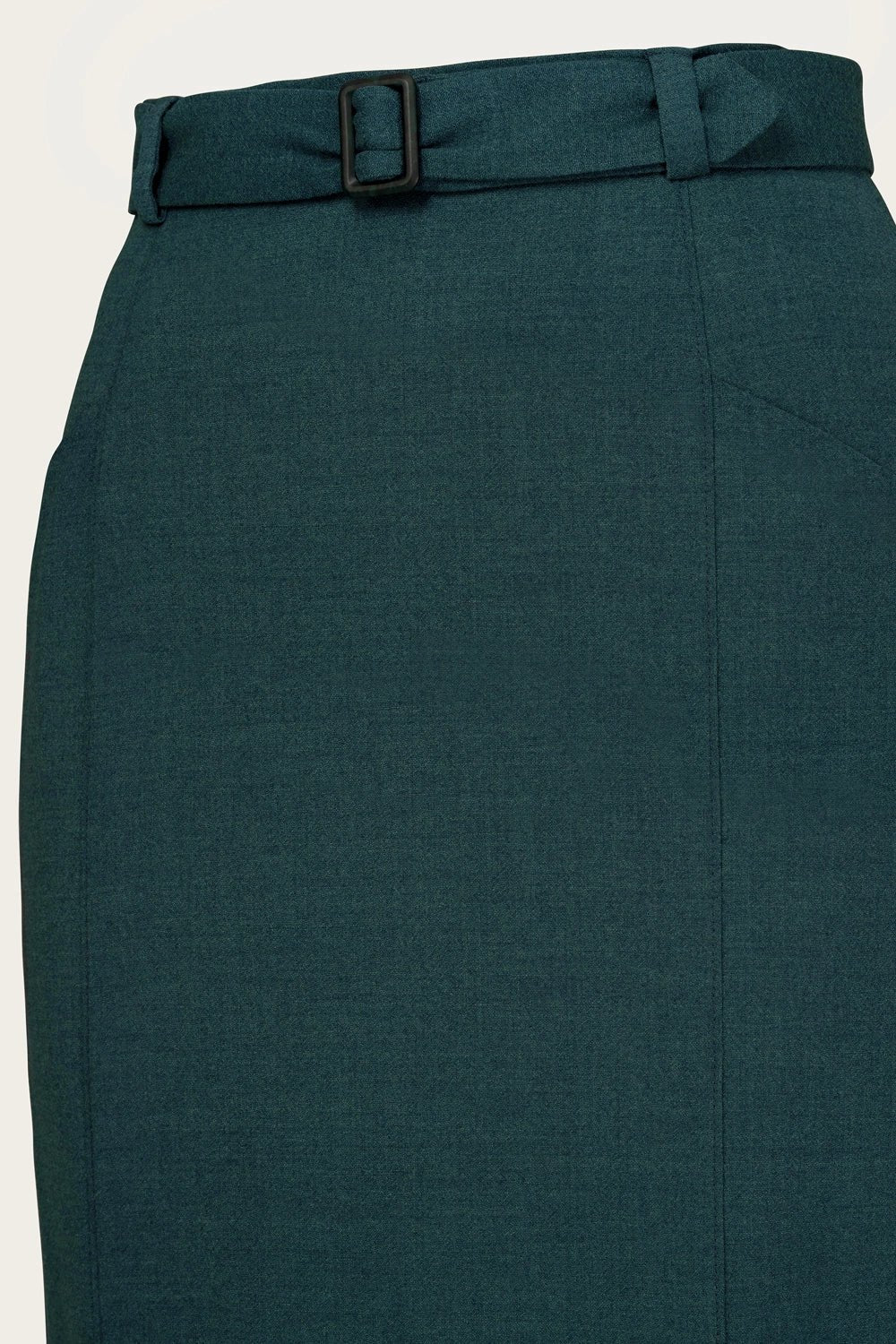 Der Triple Step Skirt aus petrolfarbenem Woll-Bouclé ist ein klassischer Bleistiftrock im Stil der 1930er-Jahre mit modernen, praktischen Details. Er verfügt über tiefe Taschen, Gürtelschlaufen, Gehschlitze vorne und hinten sowie einen passenden Stoffgürtel.