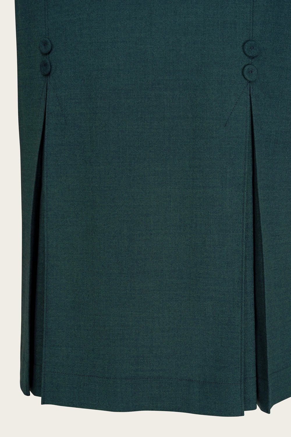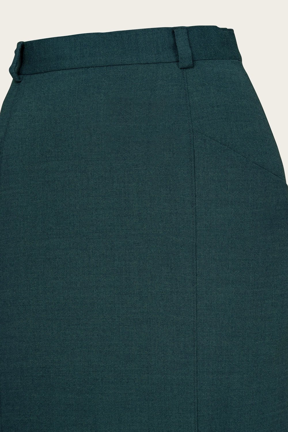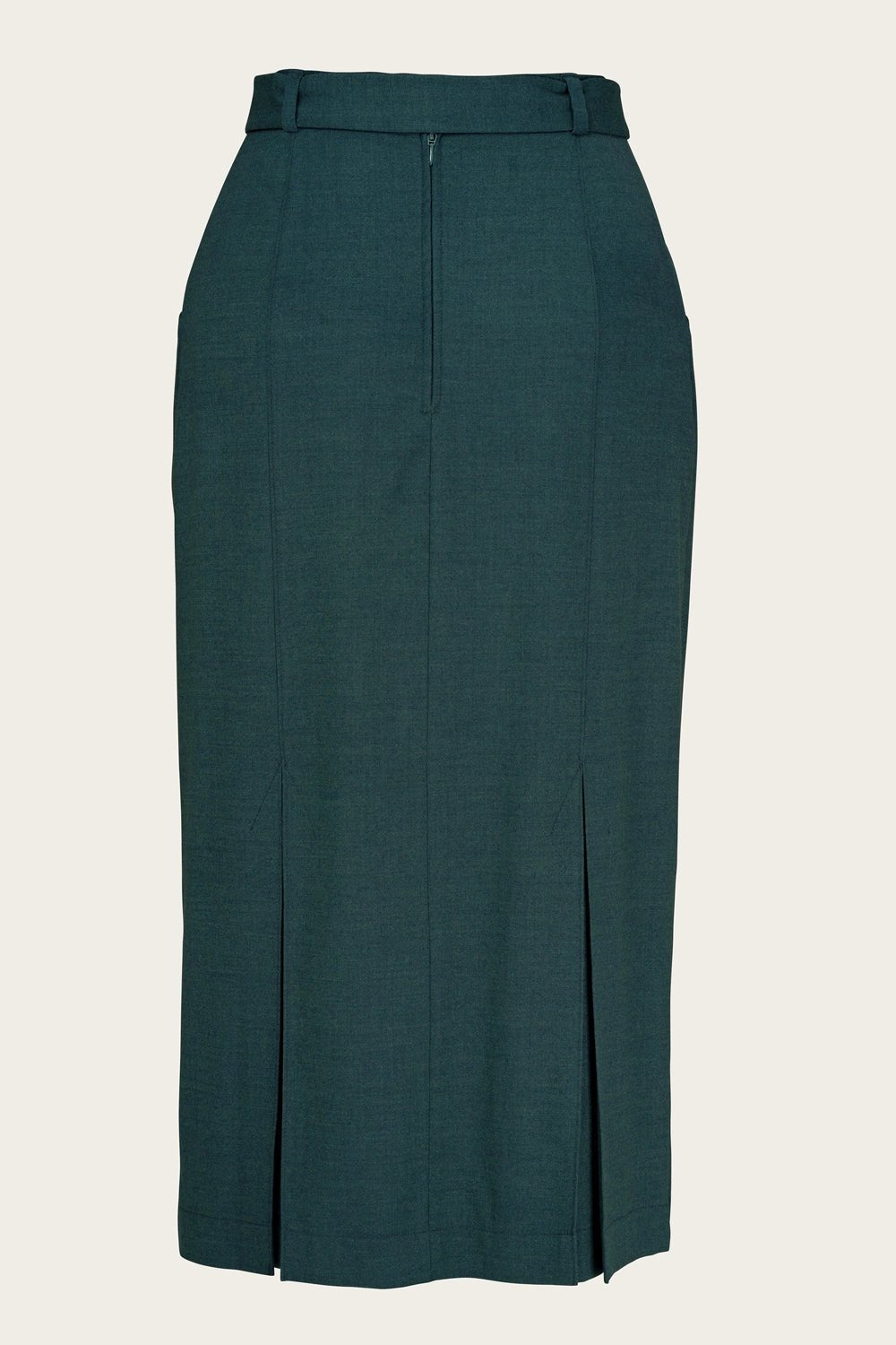 Der Triple Step Skirt aus petrolfarbenem Woll-Bouclé ist ein klassischer Bleistiftrock im Stil der 1930er-Jahre mit modernen, praktischen Details. Er verfügt über tiefe Taschen, Gürtelschlaufen, Gehschlitze vorne und hinten sowie einen passenden Stoffgürtel.