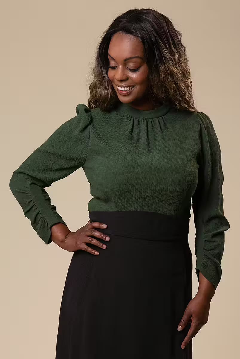 Gefertigt in Litauen aus hochwertigem Crêpe mit einem soften Innenfutter (96 % Viskose, 4 % Elasthan), bietet diese Bluse nicht nur einen eleganten Look, sondern auch angenehmen Tragekomfort. Die ¾-langen Ärmel mit zarten Raffungen an der Brustpartie sorgen für eine feminine Silhouette. Das tiefe Grün und der strukturierte Fall verleihen ihr einen besonders zeitlosen Charme. Das Material stammt aus Italien.