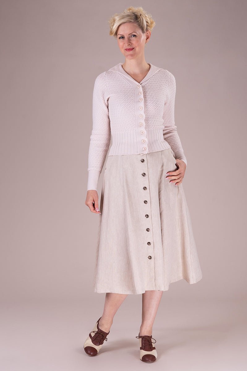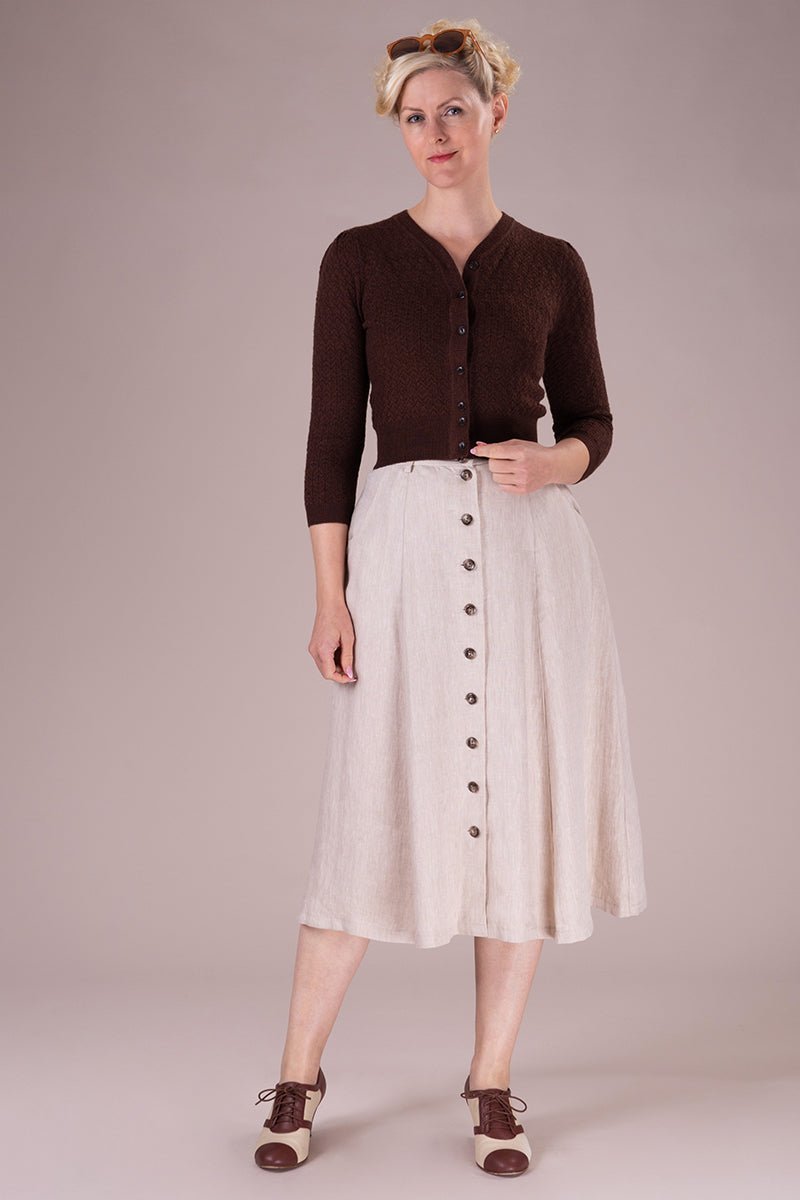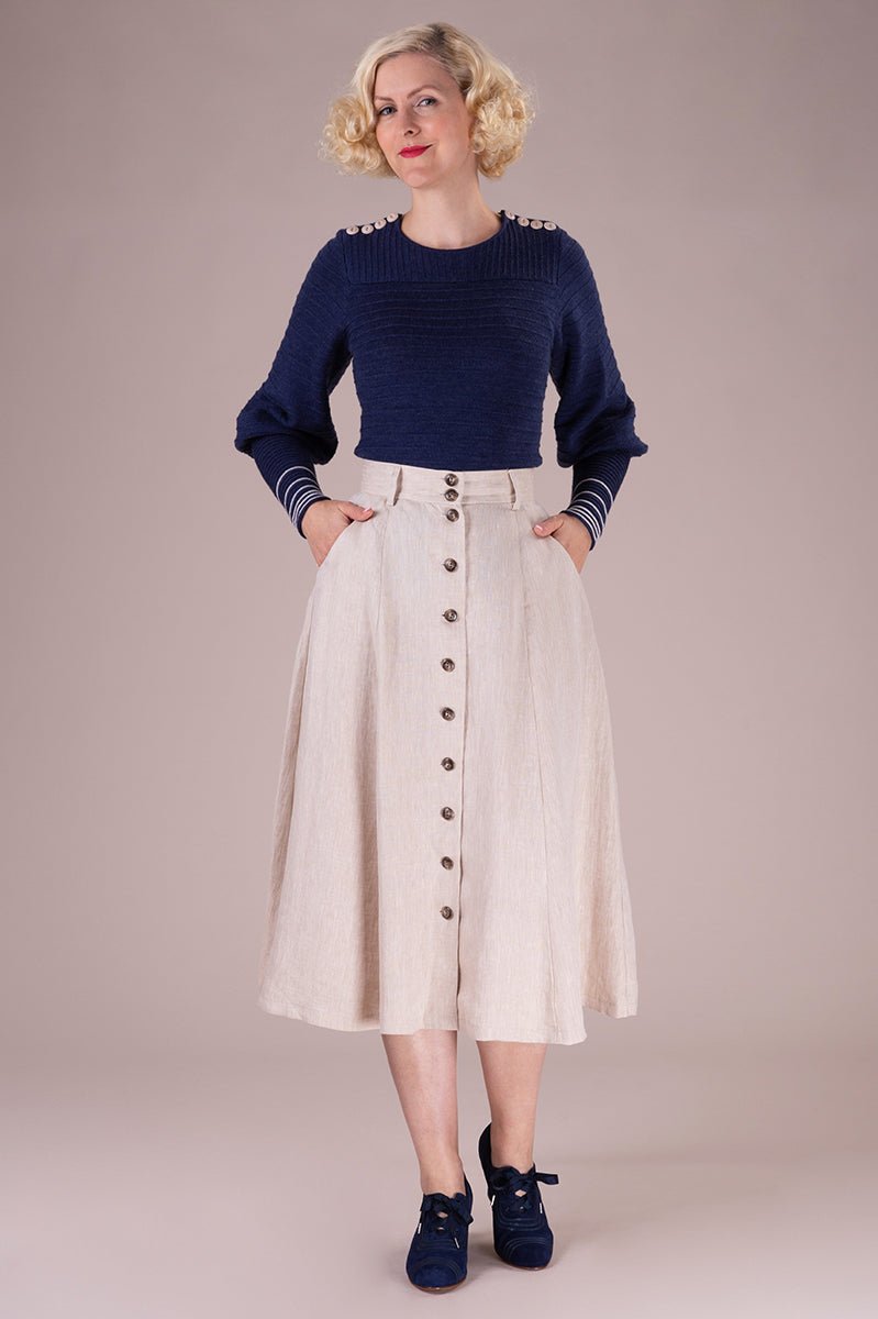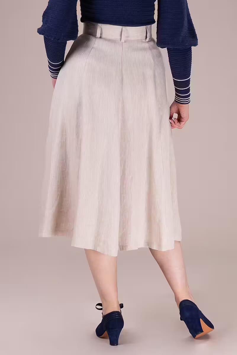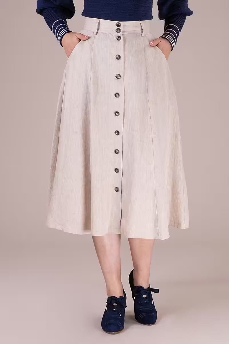 Der Vivid Voyager Skirt ist zurück – und bringt sommerliche Leichtigkeit mit Vintage-Charme in deine Garderobe! Der ausgestellte Midirock in hellem Leinen besticht durch elegante Längsnähte, eine durchgehende Knopfleiste und seine schmeichelnde Silhouette.