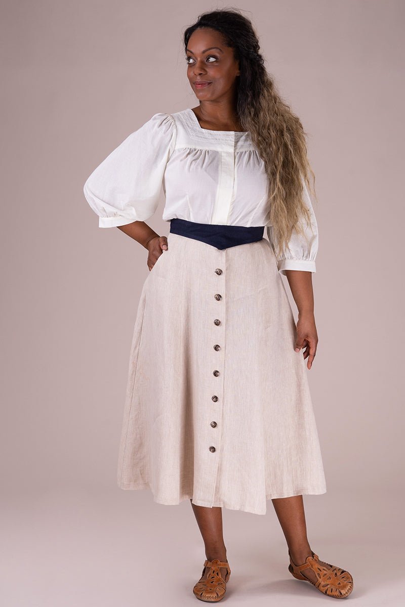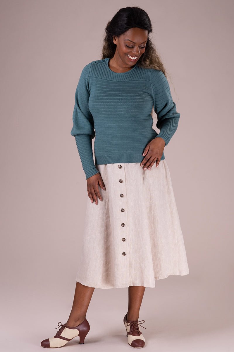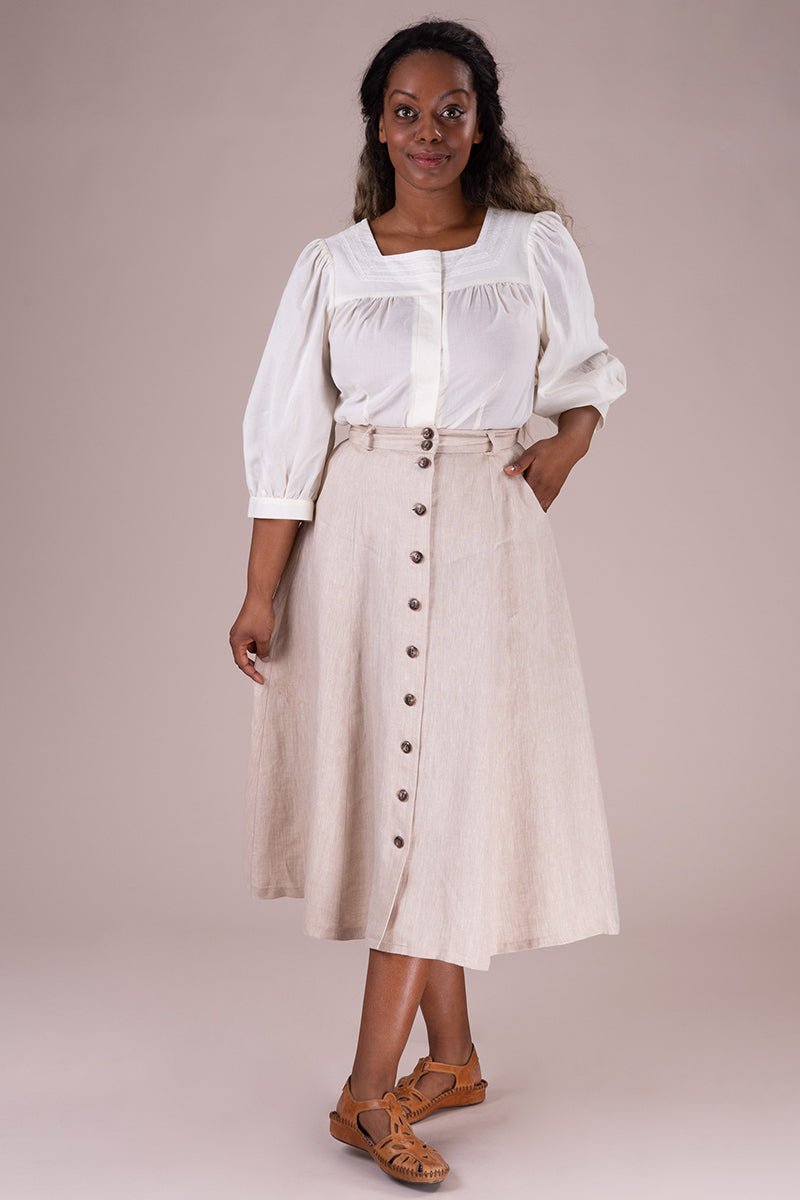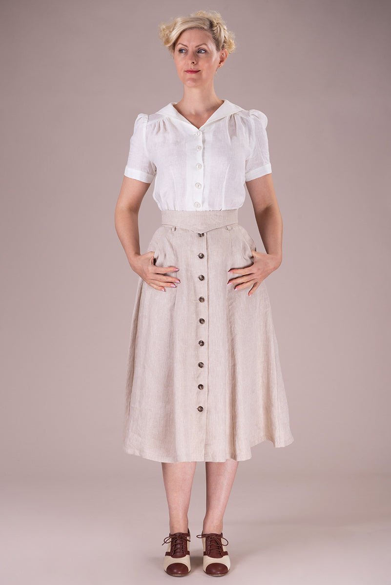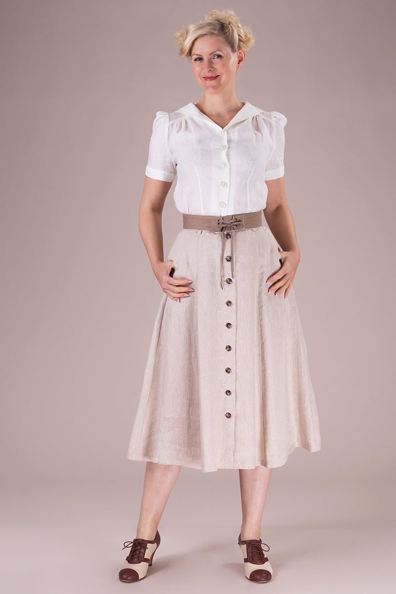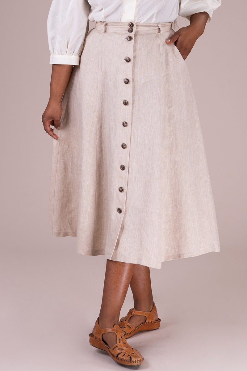 Der Vivid Voyager Skirt ist zurück – und bringt sommerliche Leichtigkeit mit Vintage-Charme in deine Garderobe! Der ausgestellte Midirock in hellem Leinen besticht durch elegante Längsnähte, eine durchgehende Knopfleiste und seine schmeichelnde Silhouette.