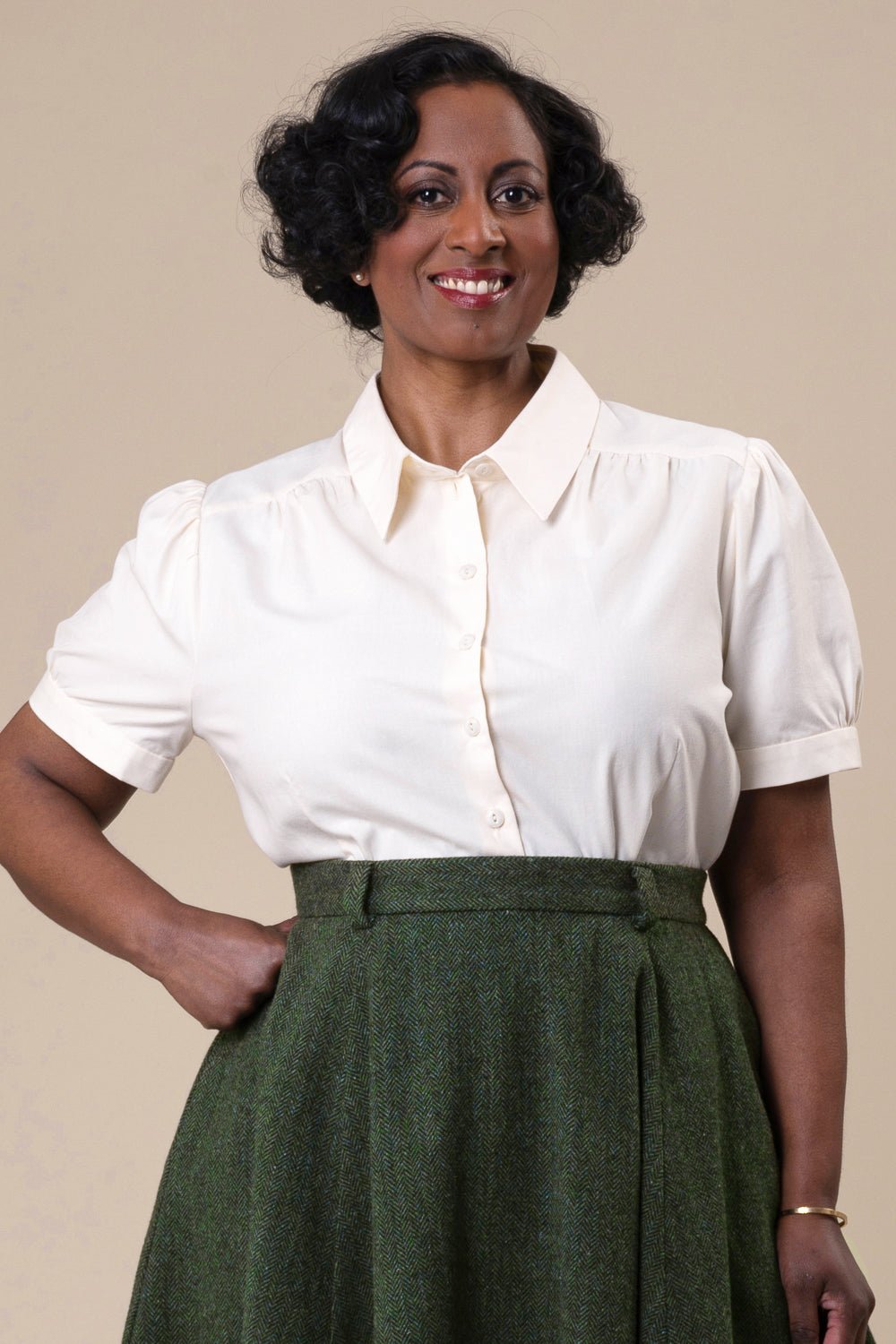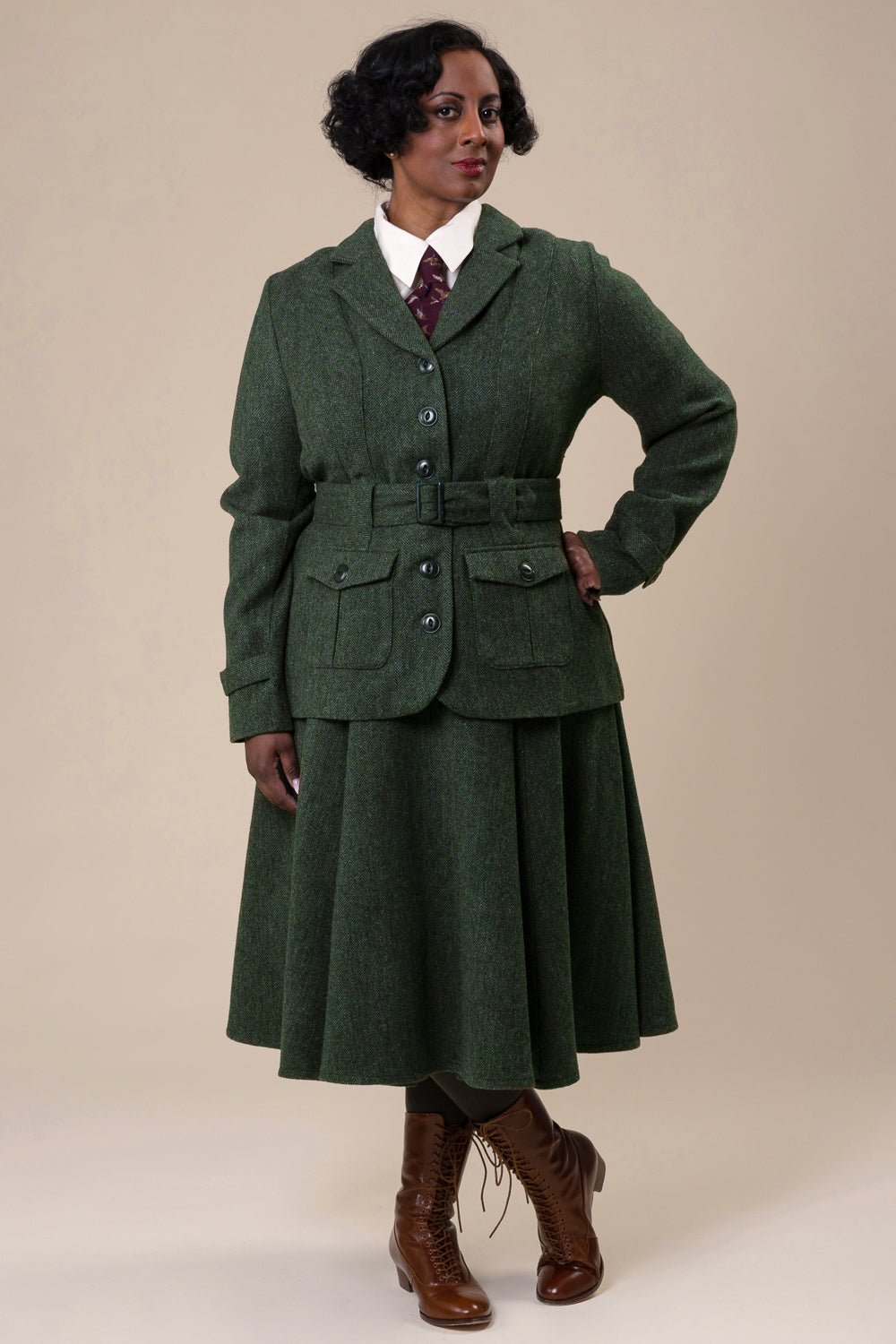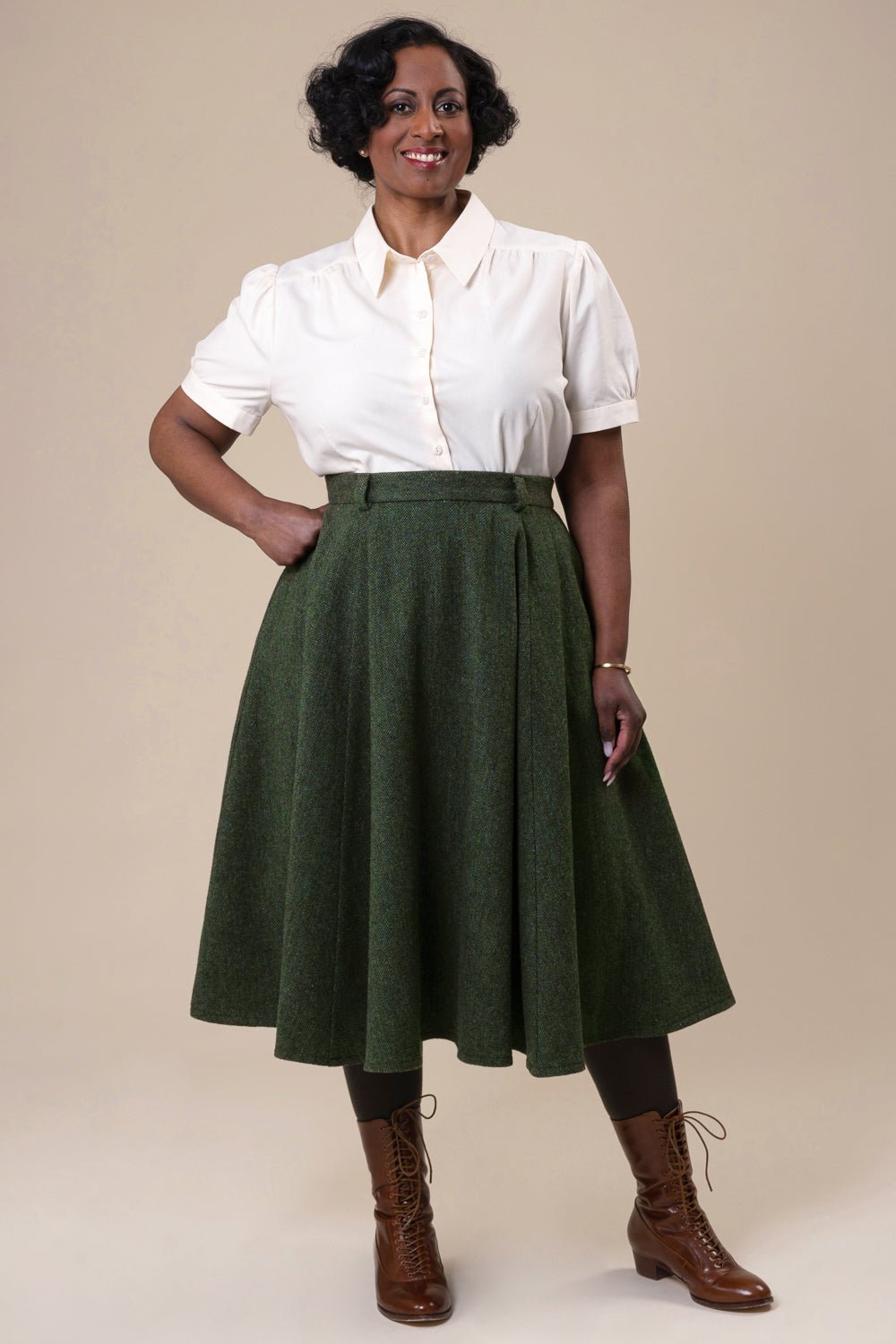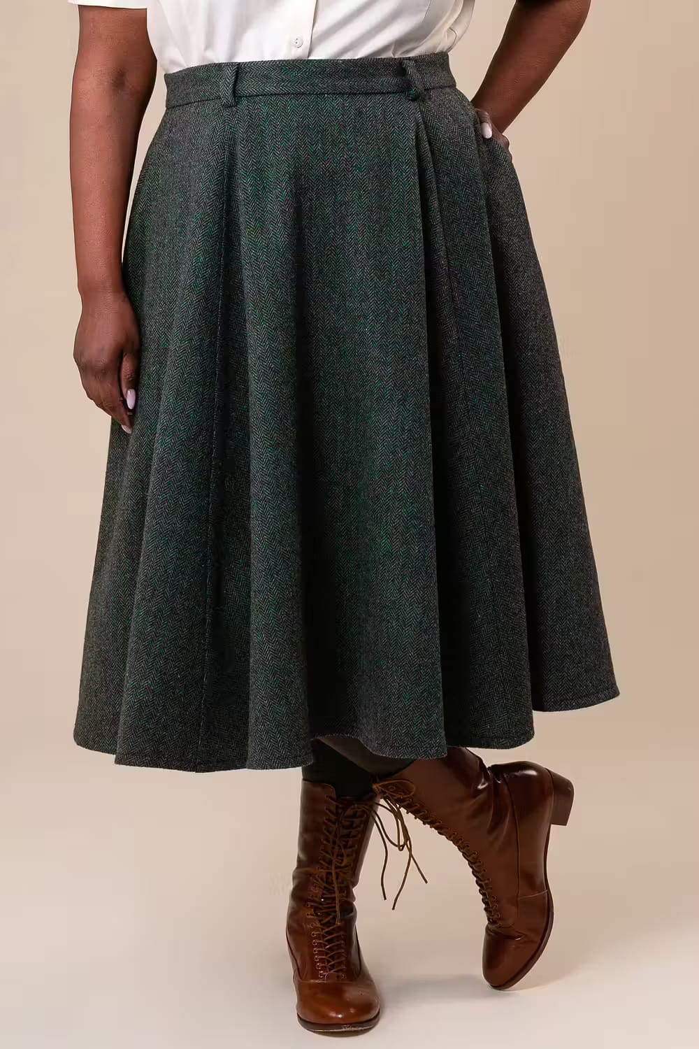 Der Winter Wonder Whirl Skirt bringt Schwung in die kalte Jahreszeit! Der klassische Swingrock mit tiefen Taschen und robustem Fischgrät-Tweed im Mélange aus Petrol und Waldgrün ist wie gemacht für einen authentischen 40er-/50er-Jahre-Look.